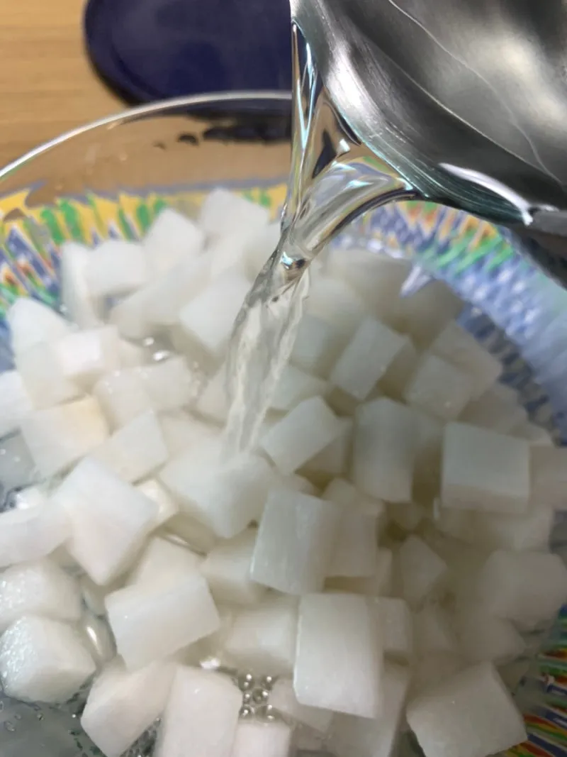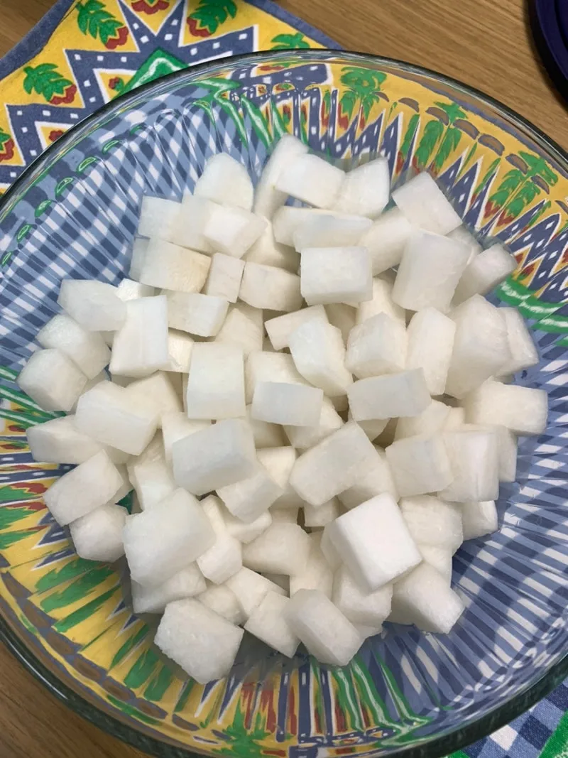 설탕:식초:물=1:1:1을 끓여 뜨거울 때 부어 치킨무를 만들었다.