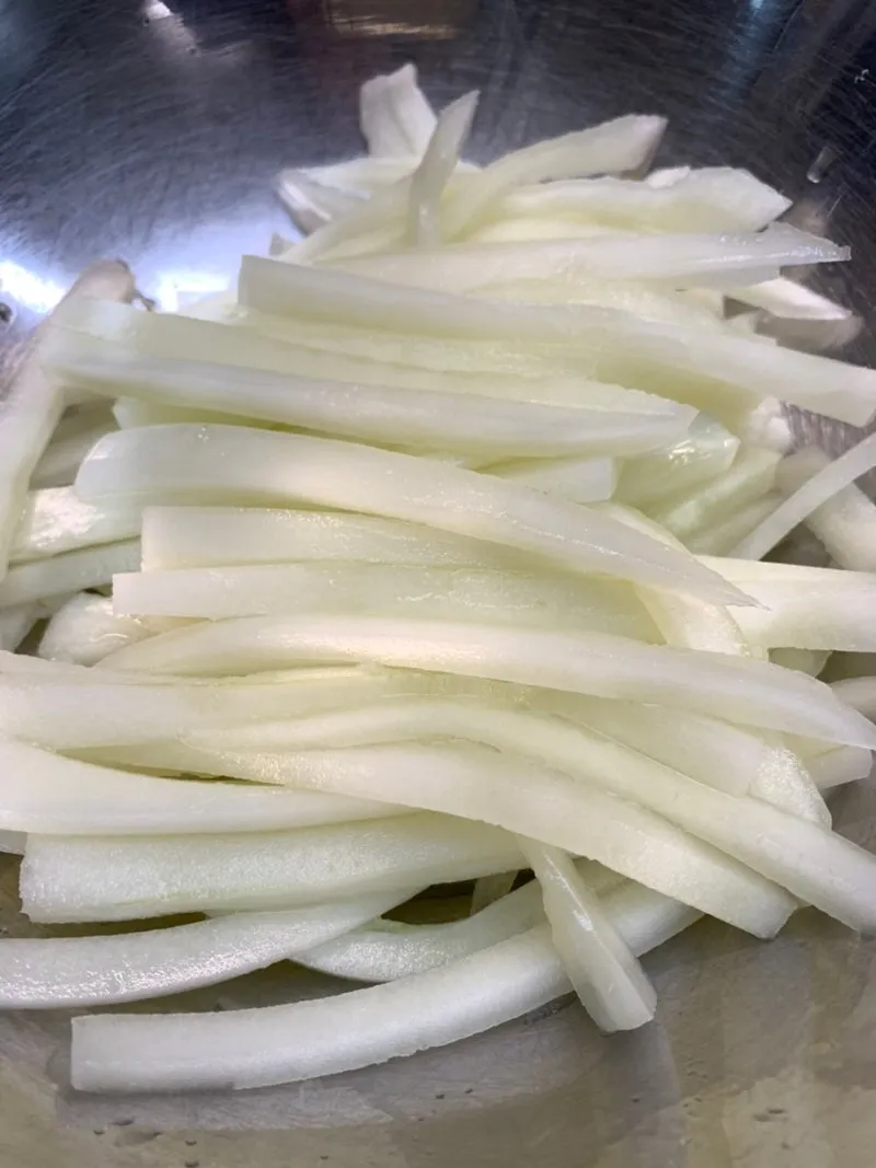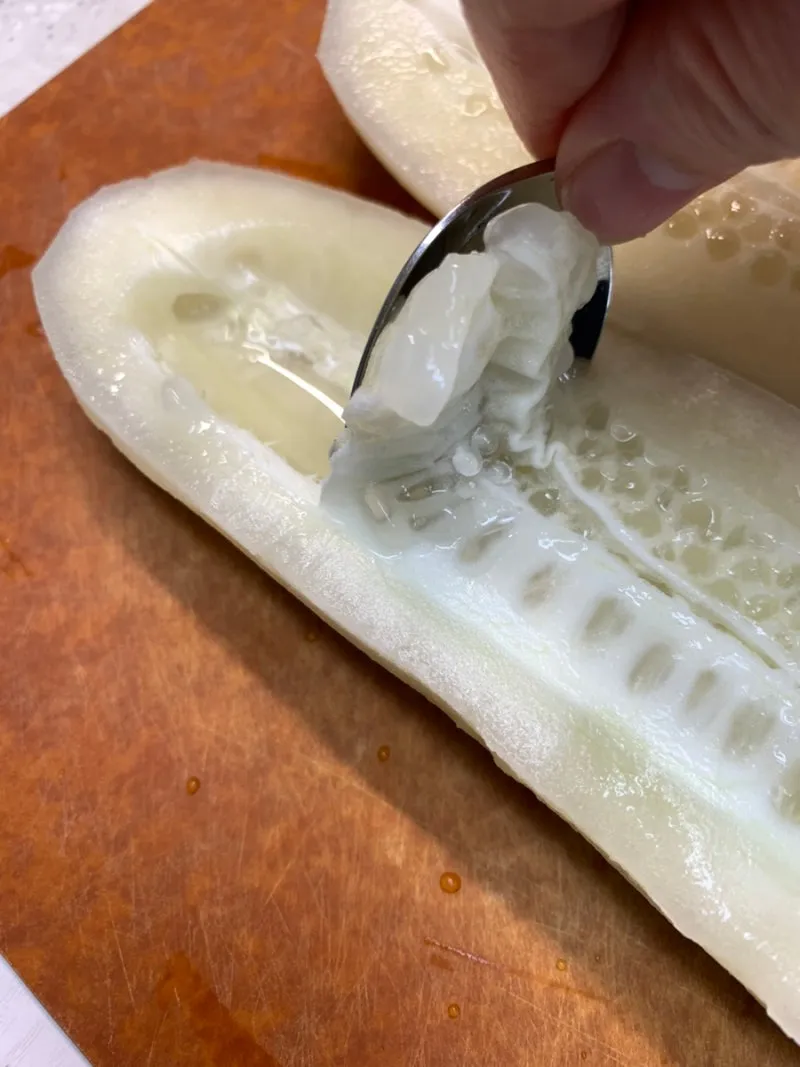 1. 노각의 껍질을 벗기고, 씨 부분은 숟가락으로 깨끗이 제거한 다음 길쭉길쭉하게 썰어준다.