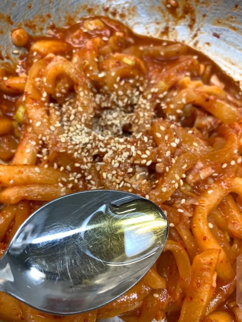 간이 되었으면 깨소금과 참기름 한 방울(절대 많으면 안 됨)을 넣어 마무리한다. (참기름 생략 가능)