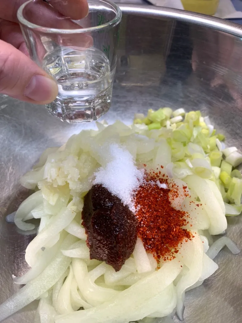 그리고 식초 1/3 (소주잔)을 모두 넣고 잘 버무린다. 실온에 10분간 둔다.