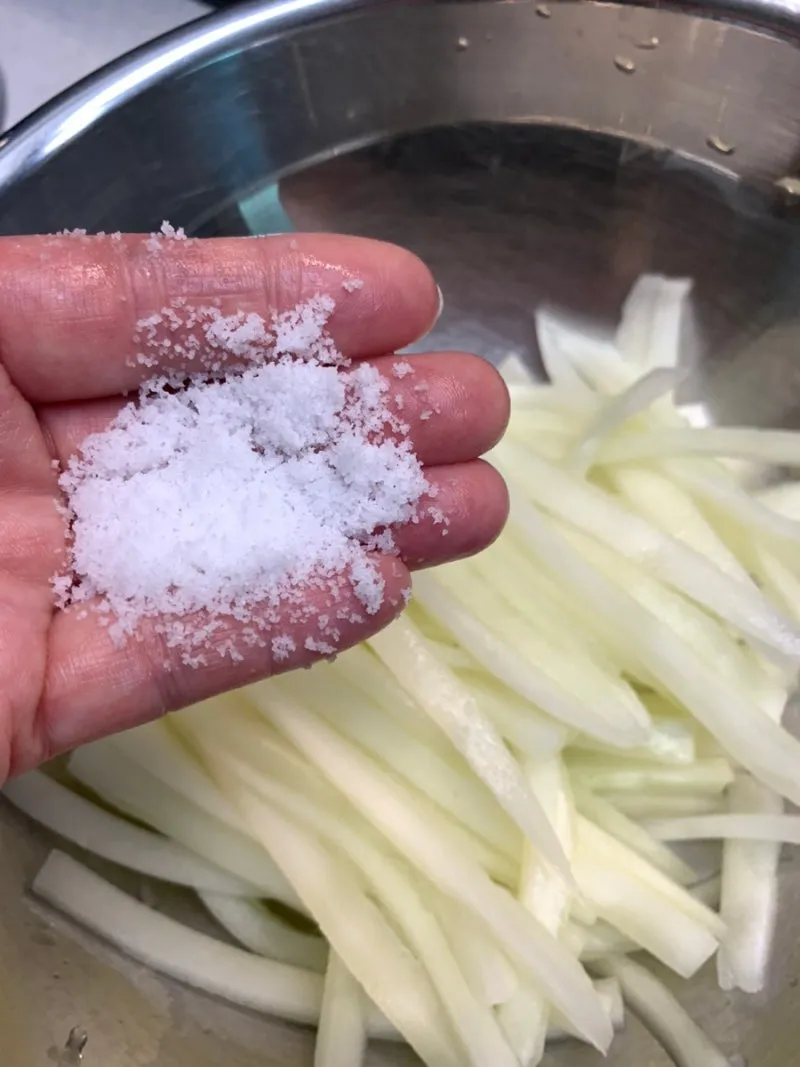 2. 꽃소금을 반스푼 정고 넣고 조물조물하여 잠시 둔다.(10~15분)