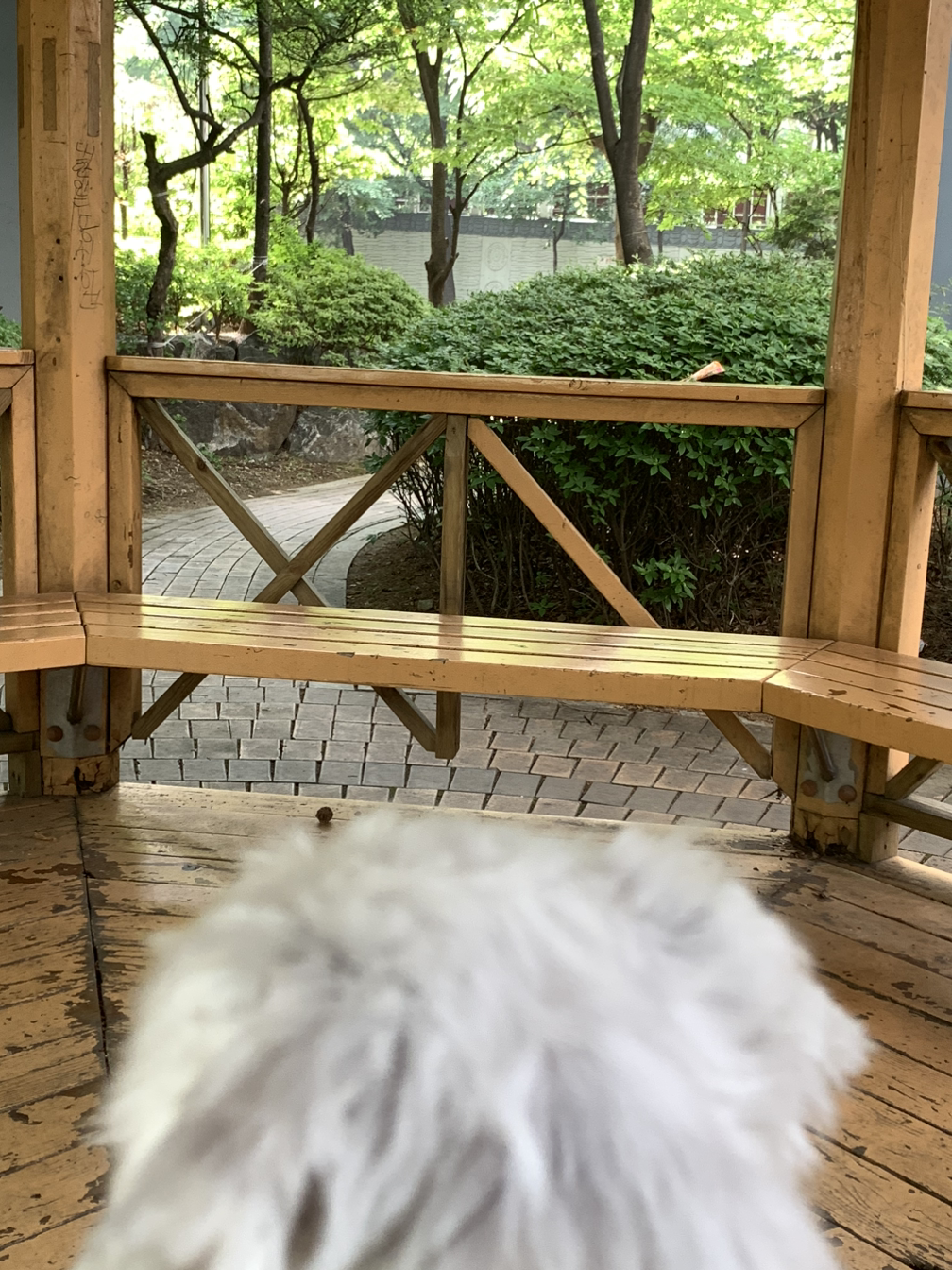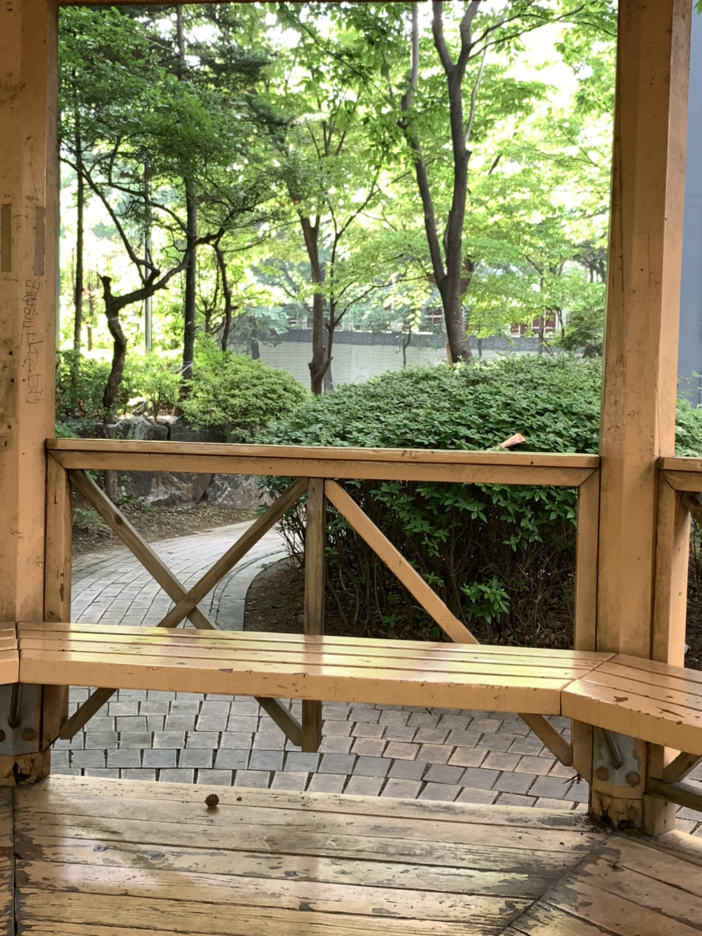 초록초록 나무가 보이는 정자 벤치가 나와요.