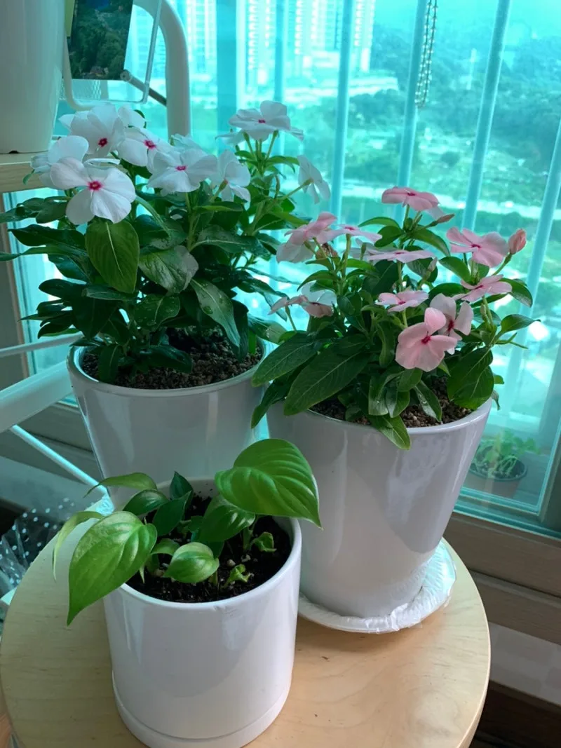 분홍색 두 포트와 흰색 두 포트를 각각 하나씩의 화분에 심어서 집으로 가져왔다.