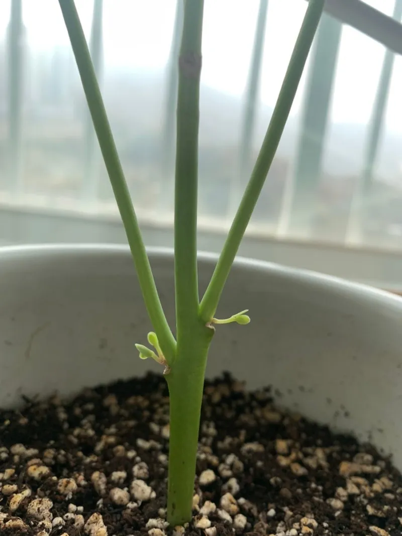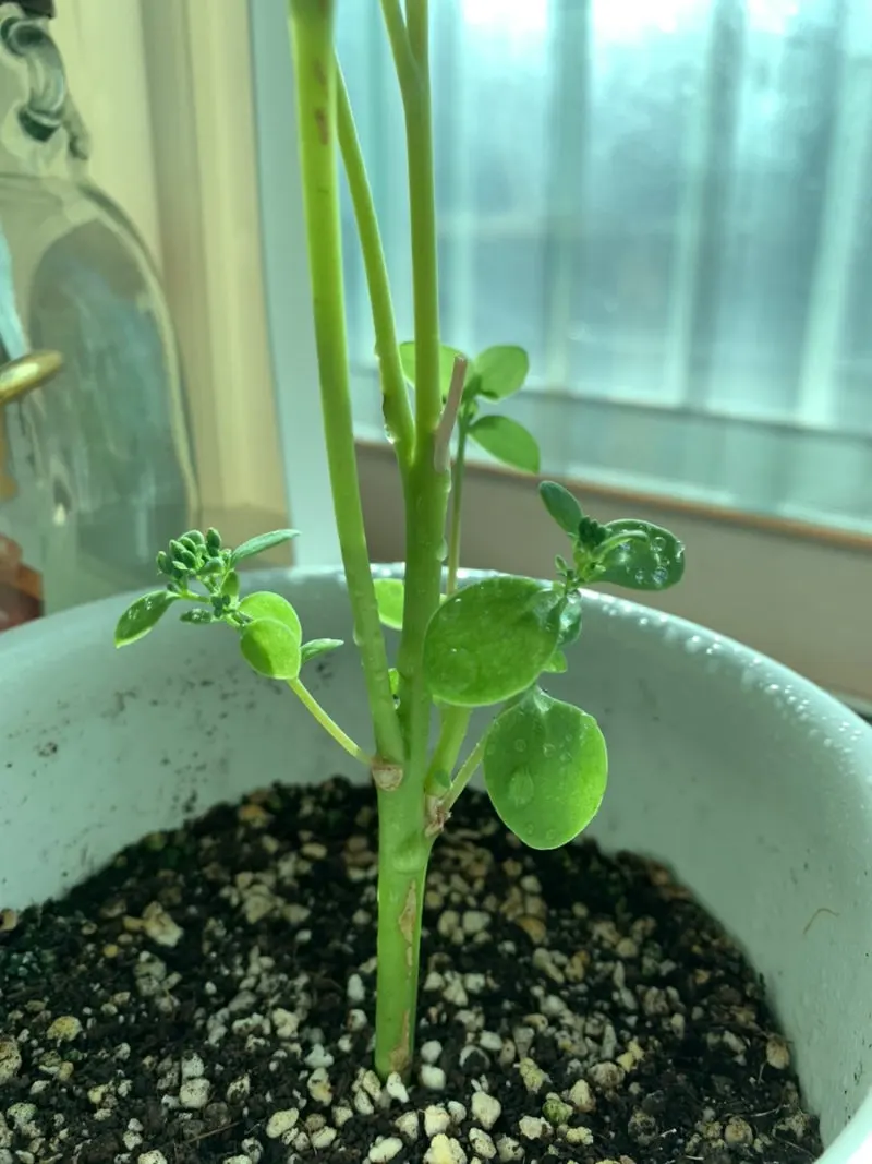 꽃꽂이 화병 속에서 뿌리를 내려 흙에 심어주니 새 순이 나와 다시 꽃이 피었다.