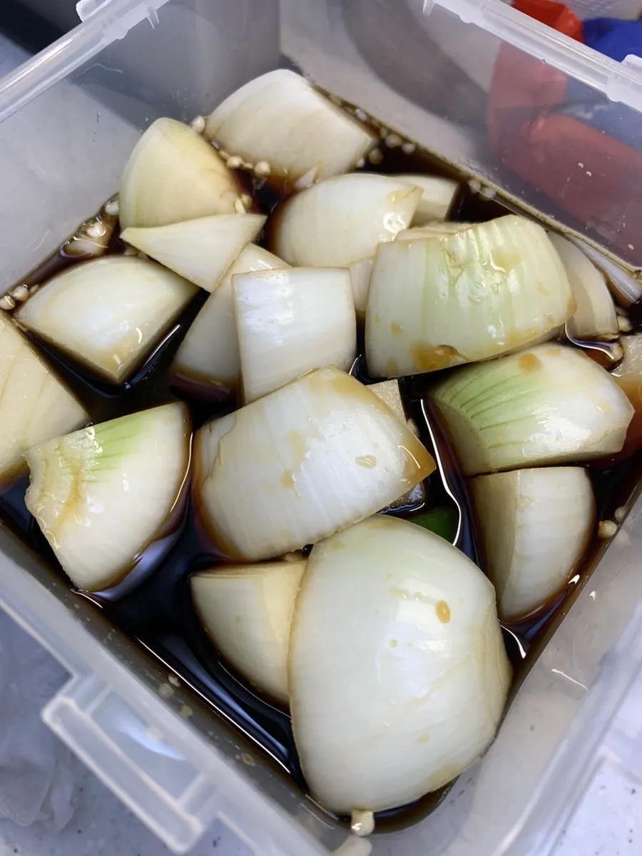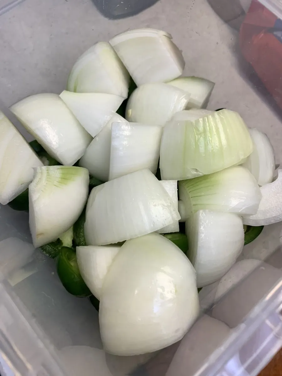4. 고추를 담고 그 위에 양파를 담는다.