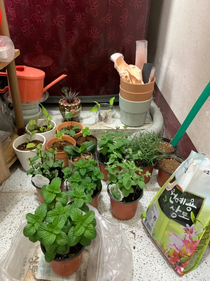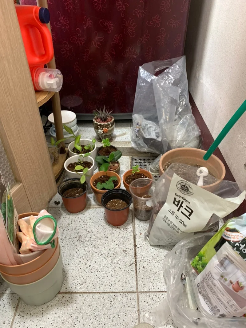 한 평도 안 되는 세탁기 앞의 공간에서 땀을 흘리며 쭈그리고 앉아 분갈이를 하는지..