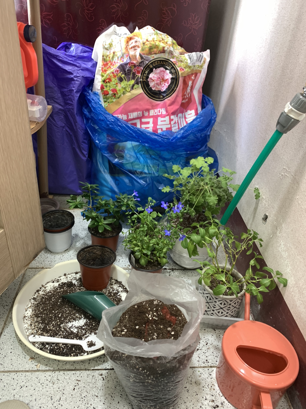 일일초와 로벨리아, 외목대 장미허브, 포인세티아는 분갈이를 해주고, 이모의 제라늄은 좀더 큰 화분으로 옮겼다.