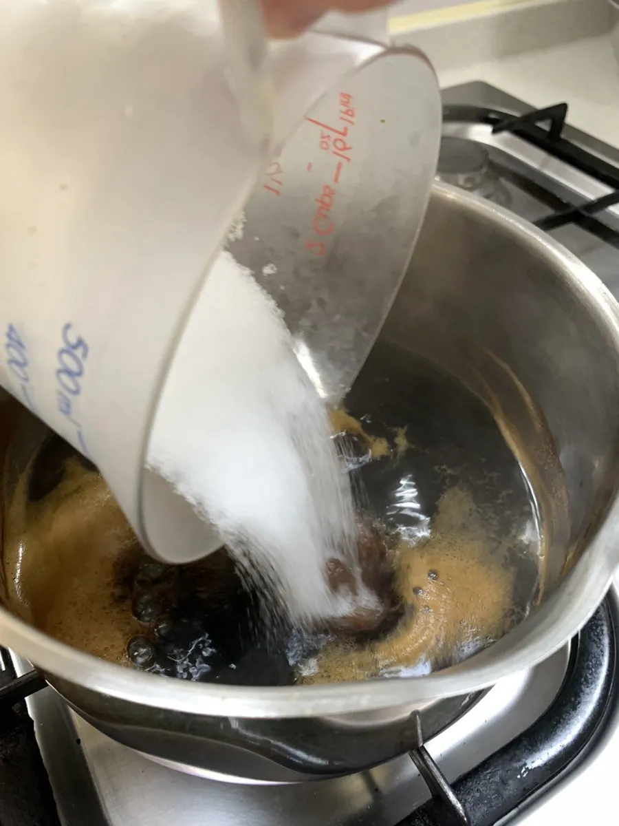 2. 끓는 간장물에 설탕을 넣어 잘 녹이고 한소끔 끓인 다음 불을 끈다.