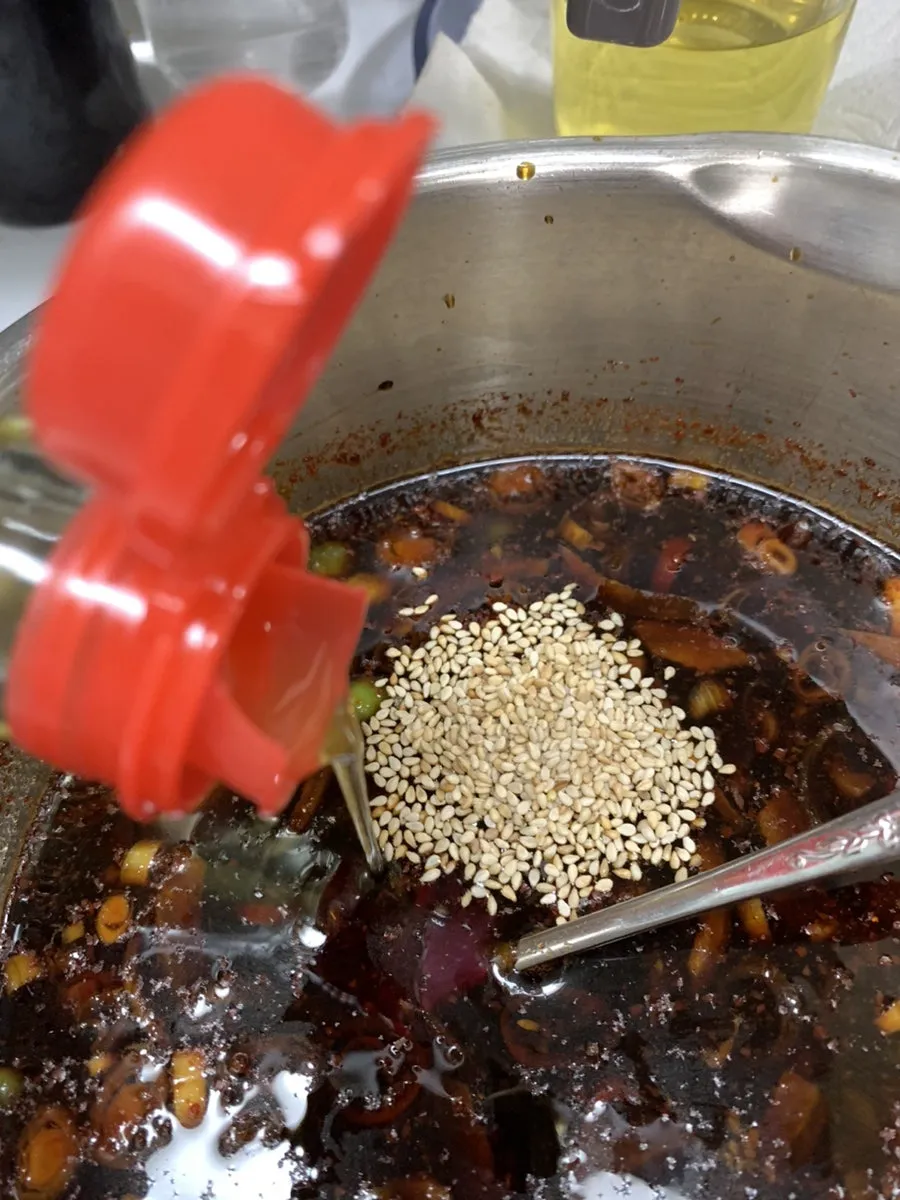 4. 양념장이 완전히 식으면 참기름과 통깨를 넣고 잘 저어준다.