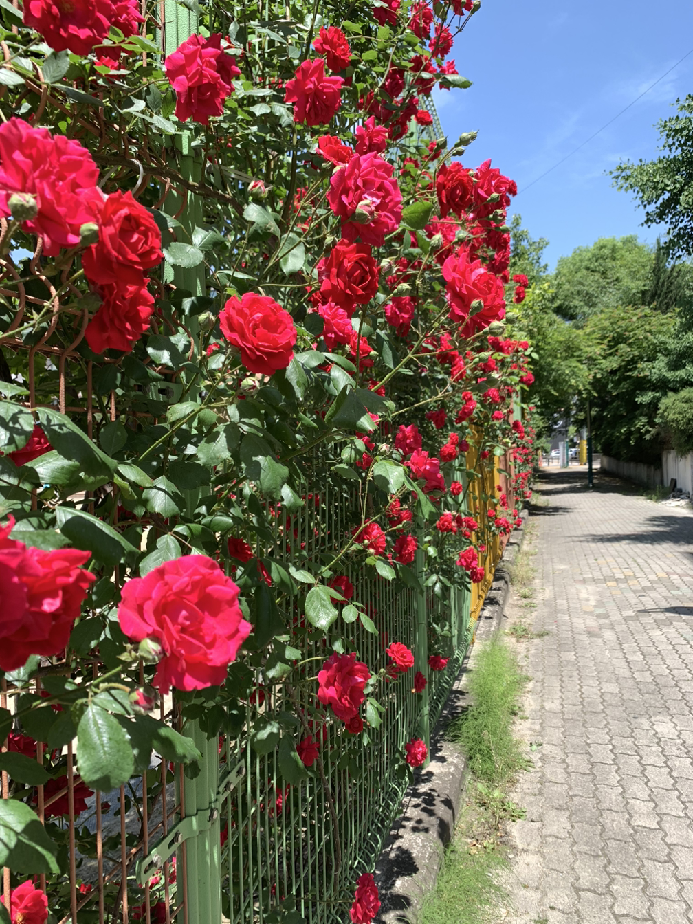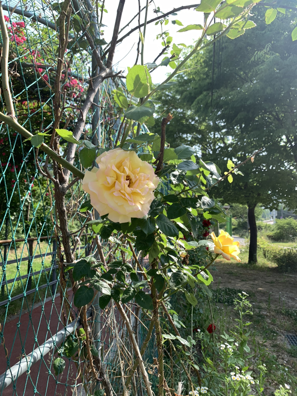 대문옆 담 쪽엔 봄에 꽃을 피우는 흰 목련 나무와 빨간 넝쿨 장미와 개나리가 심어져 있어서 담장 위의 뾰족한 철심을 빨간 장미의 넝쿨이 타고 자라며 오월이면 빨간 장미가 담 넘어 밖에서도 아주 예쁘게 보였다. 보기 싫은 철심은 감춰졌고, 넝쿨 장미가 품고 있는 가시는 절대 얕보면 안 되는 보안장치였다.
