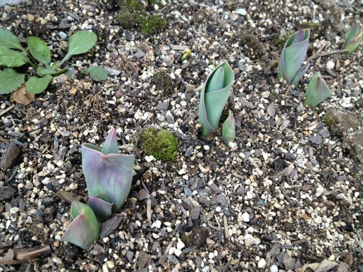 보라색 튤립 구근을 가을에 심으면 월동 후 봄에 싹이 나와 꽃이 피었다.