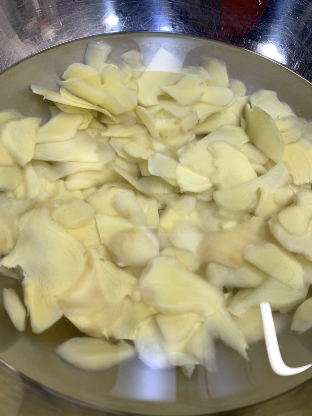2. 손질이 끝난 생강을 동량의 설탕과 버무린다.