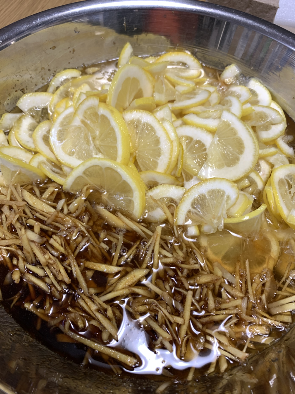 레몬과 생강을 깨끗이 손질하고. 얇게 썰어 동량의 설탕에 재운다.