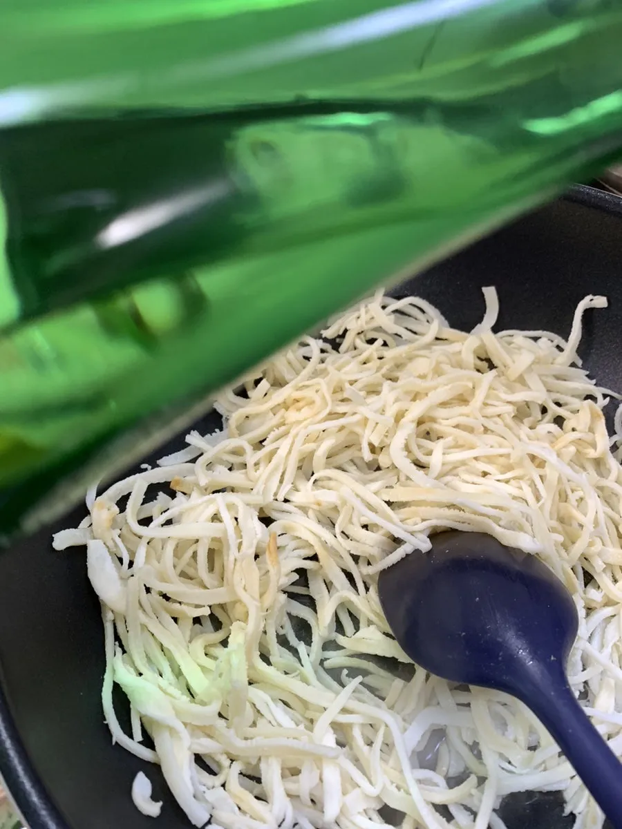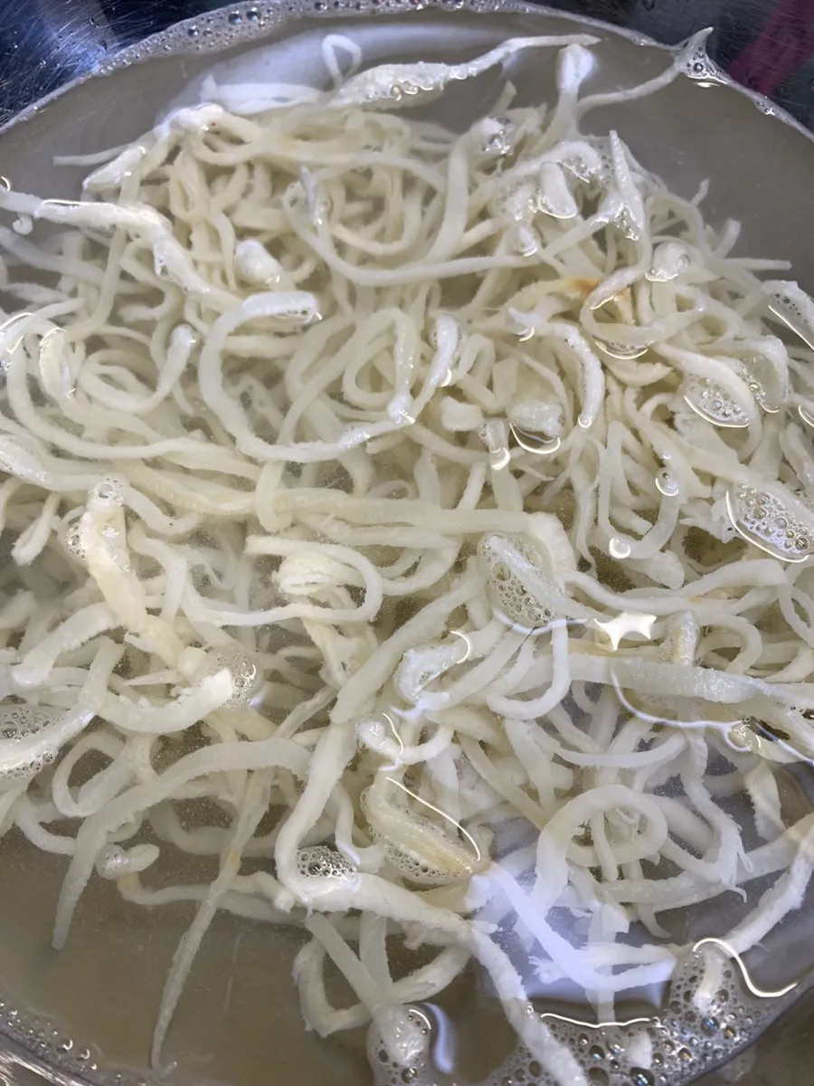 3. 진미채를 건져 꼭 짜고, 마른 팬에 진미채를 센 불로 볶아 수분을 날린 후 청주를 두 술을 넣고 볶아 다시 수분을 모두 날려준다.(비린내 제거)