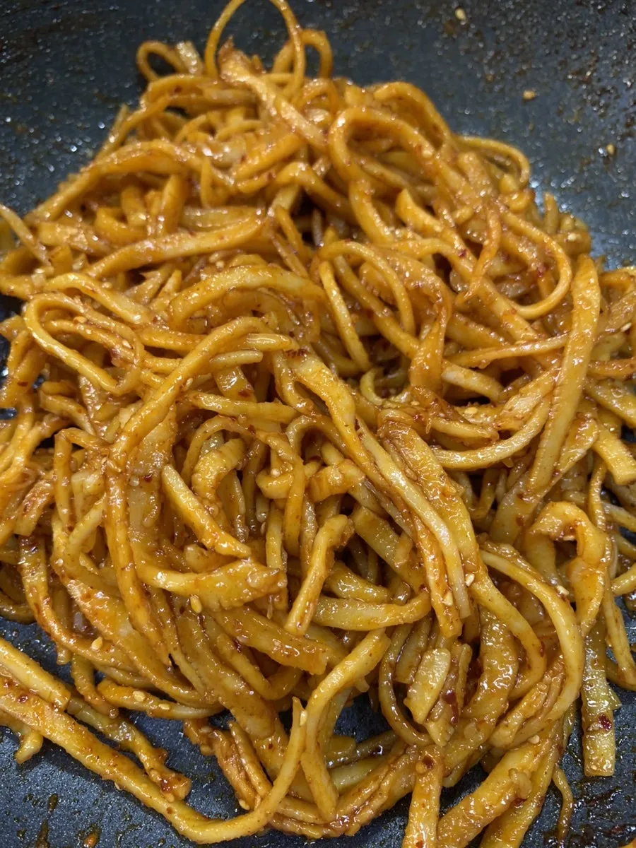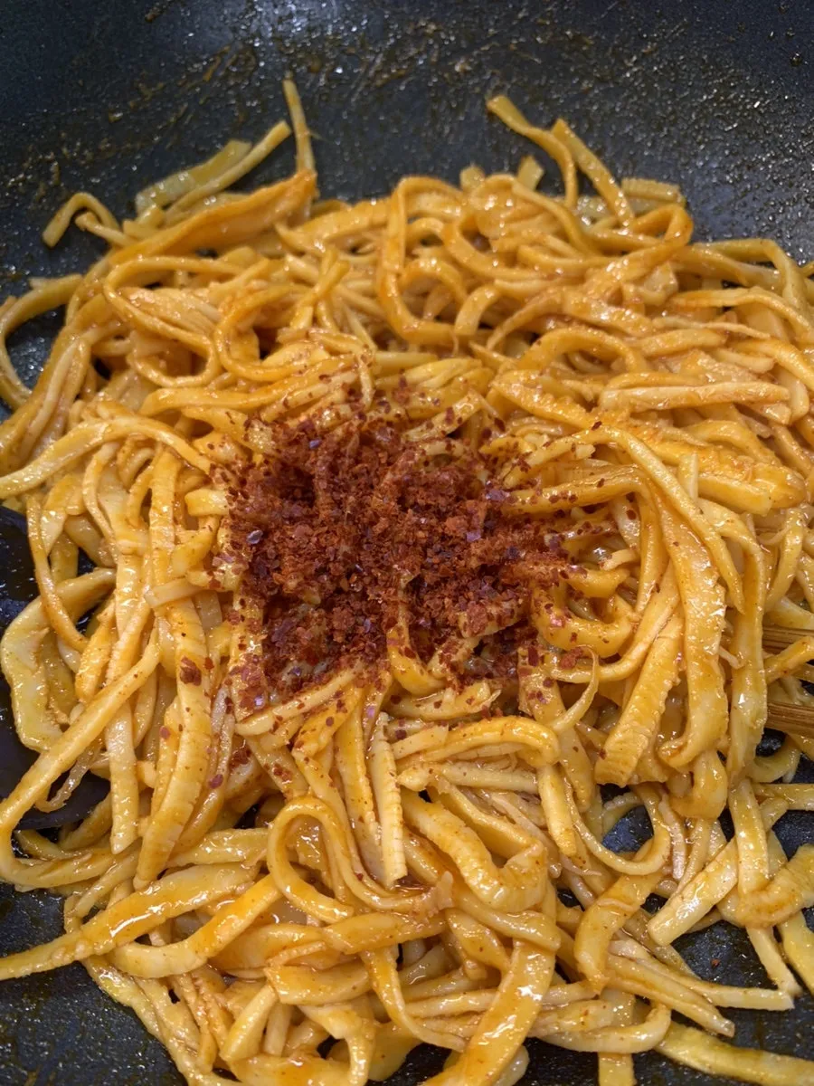 5. 수분이 모두 날아가고 골고루 버무려졌으면 식용유와 매운 고춧가루를 넣어 버무리듯 볶는다.