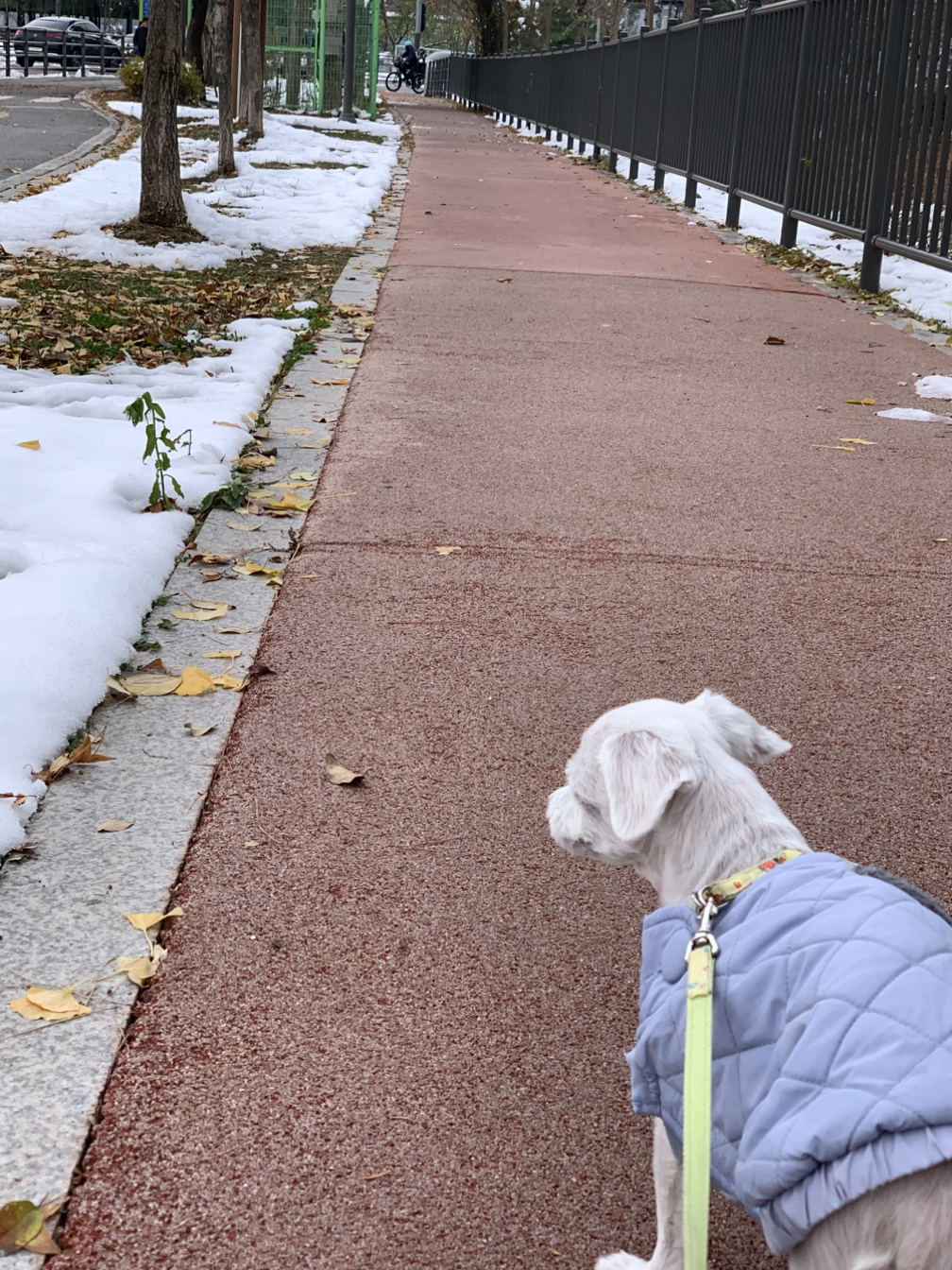 이튿날 집에서 내려다 보이는 산책로에 많이 온 눈이 좀 치워진 것 같으니 녹기 전에 산책 가자..