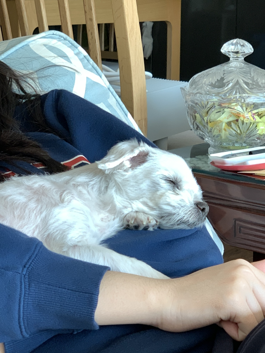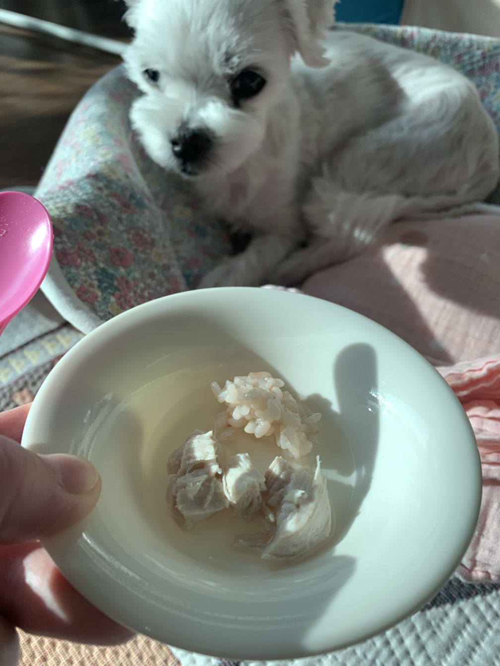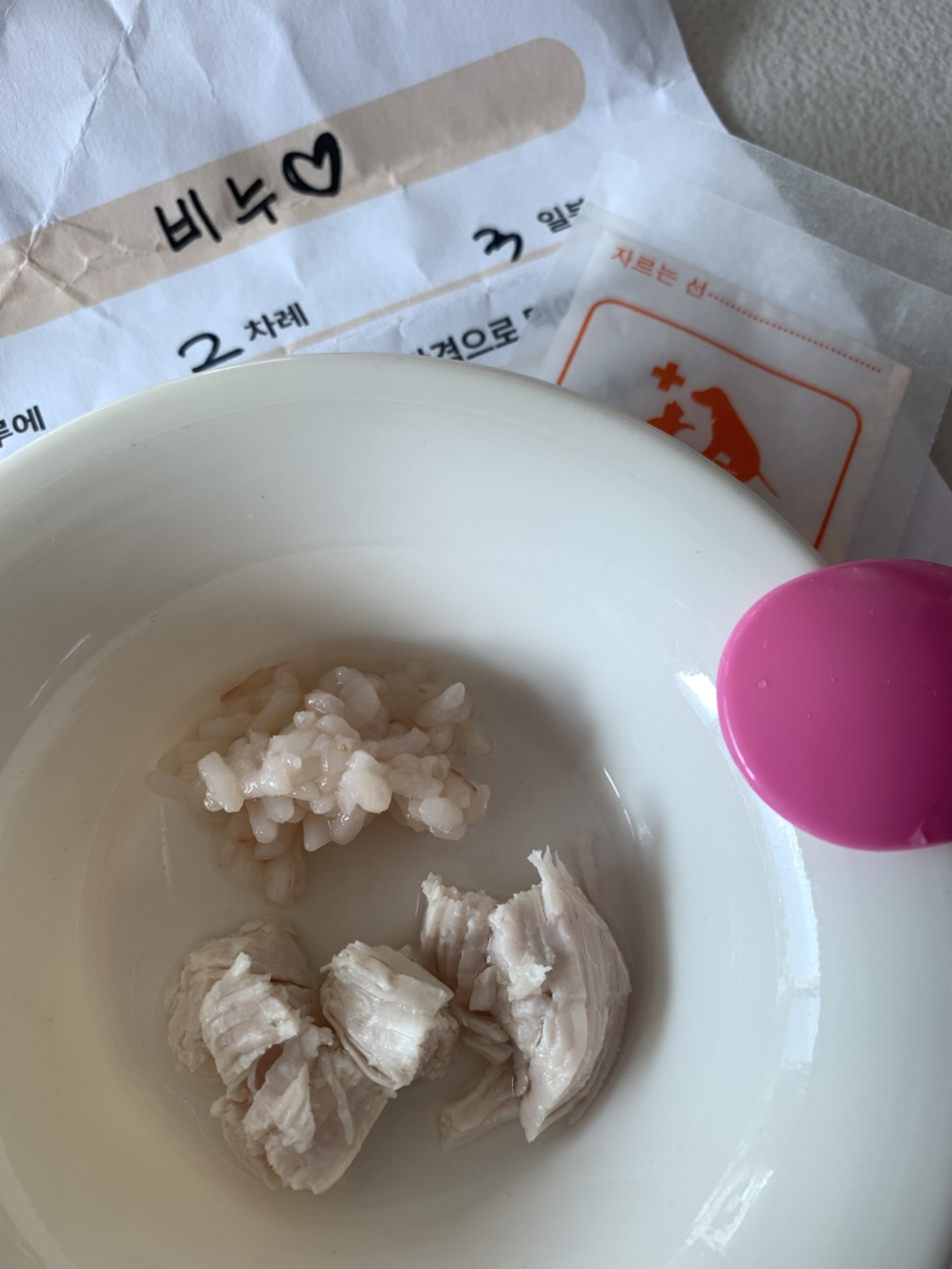 태어나서 우리 집에 오기 전 엄마와 함께 살 때 그 주인은 닭고기를 삶아주었다고 한다. 의사 선생님은 질색을 하며 안된다고 하셨다고 했다.
