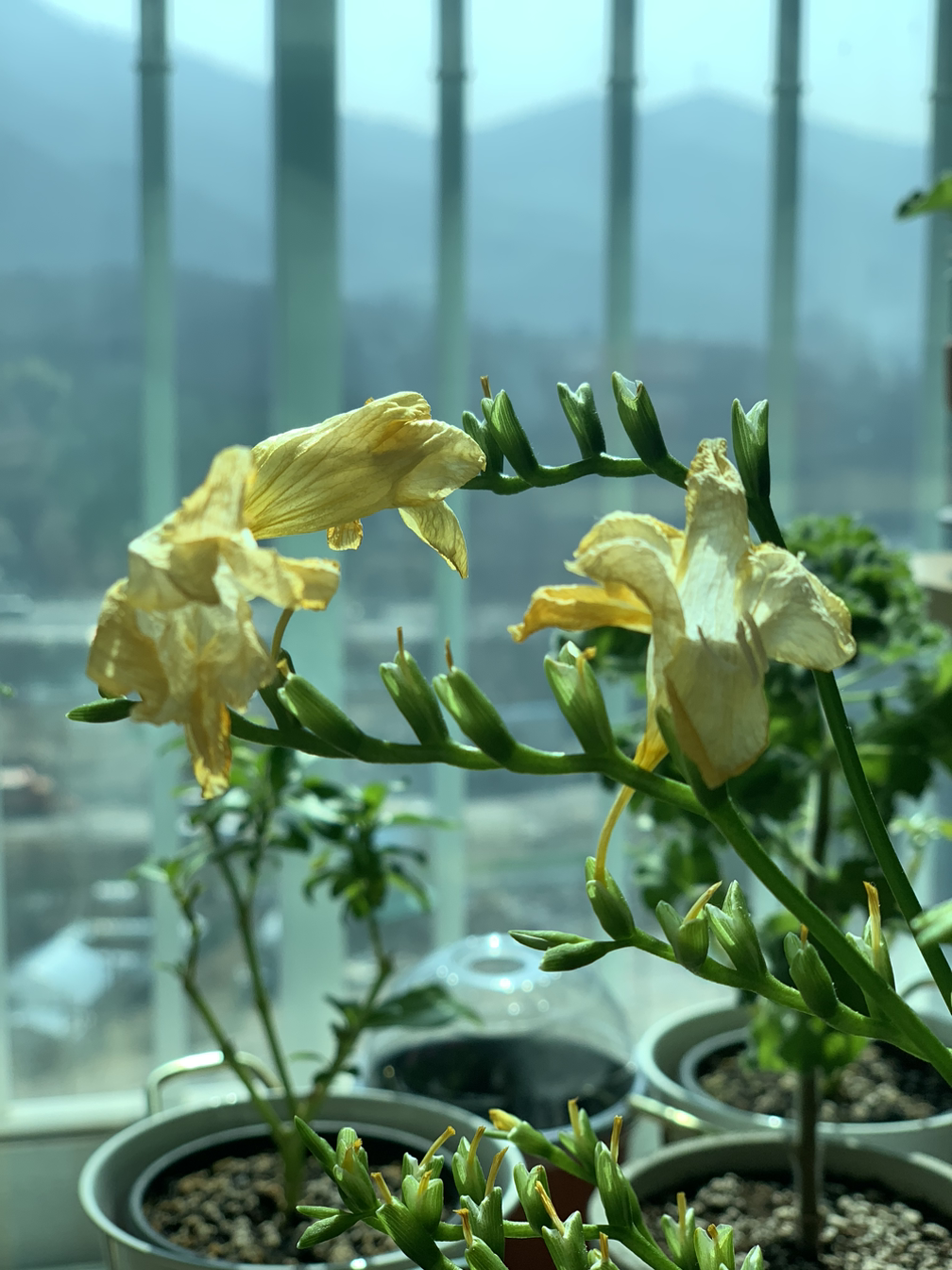 올해의 프리지아는 구근마다 꽃대를 올려 화려하게 많은 꽃을 보여주었다. 그리고