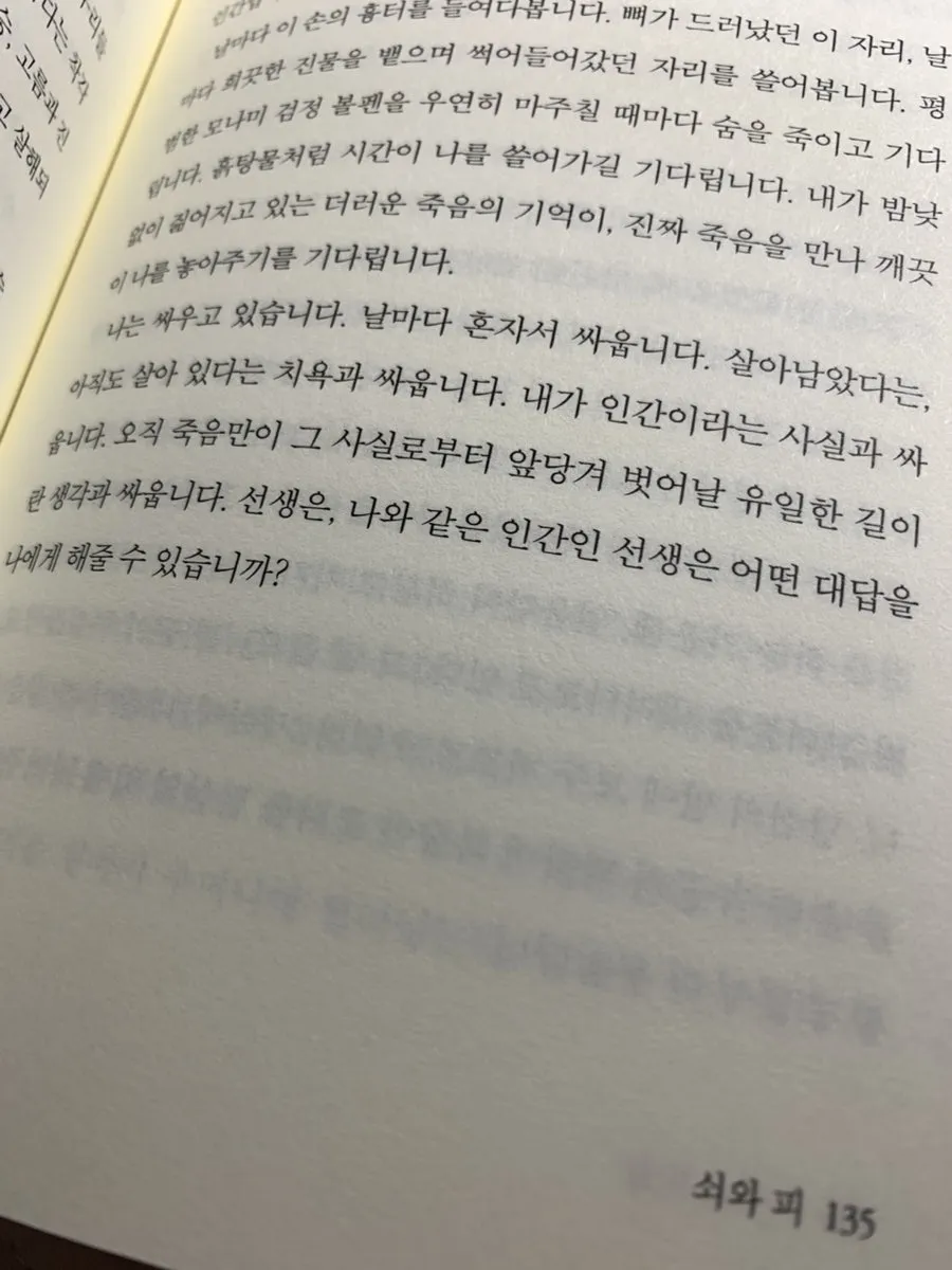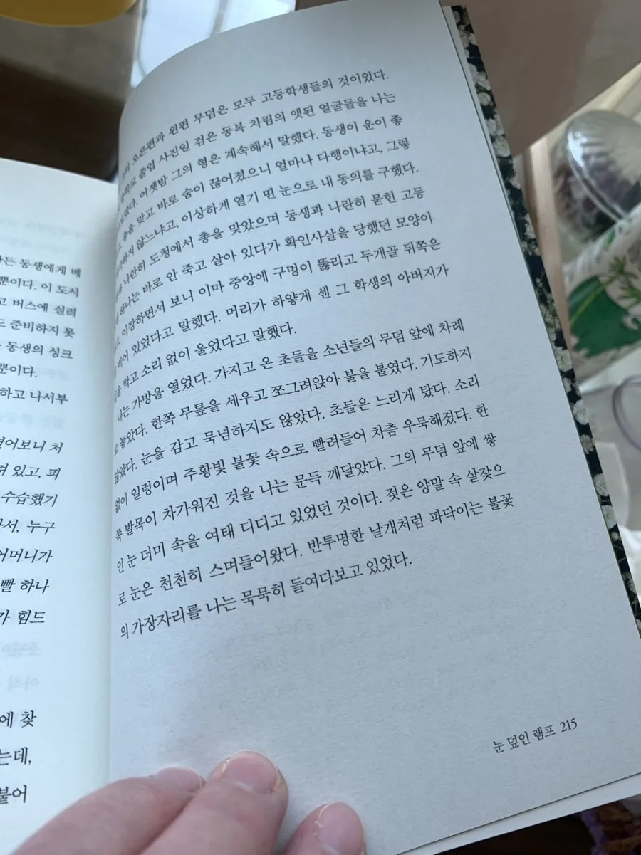 독서 내내 스스로가 읽는 것이 아닌 소년의 엄마 같은 한강 작가가 특유의 읊조리는 말투로 이야기해 주는 것을 듣는다.