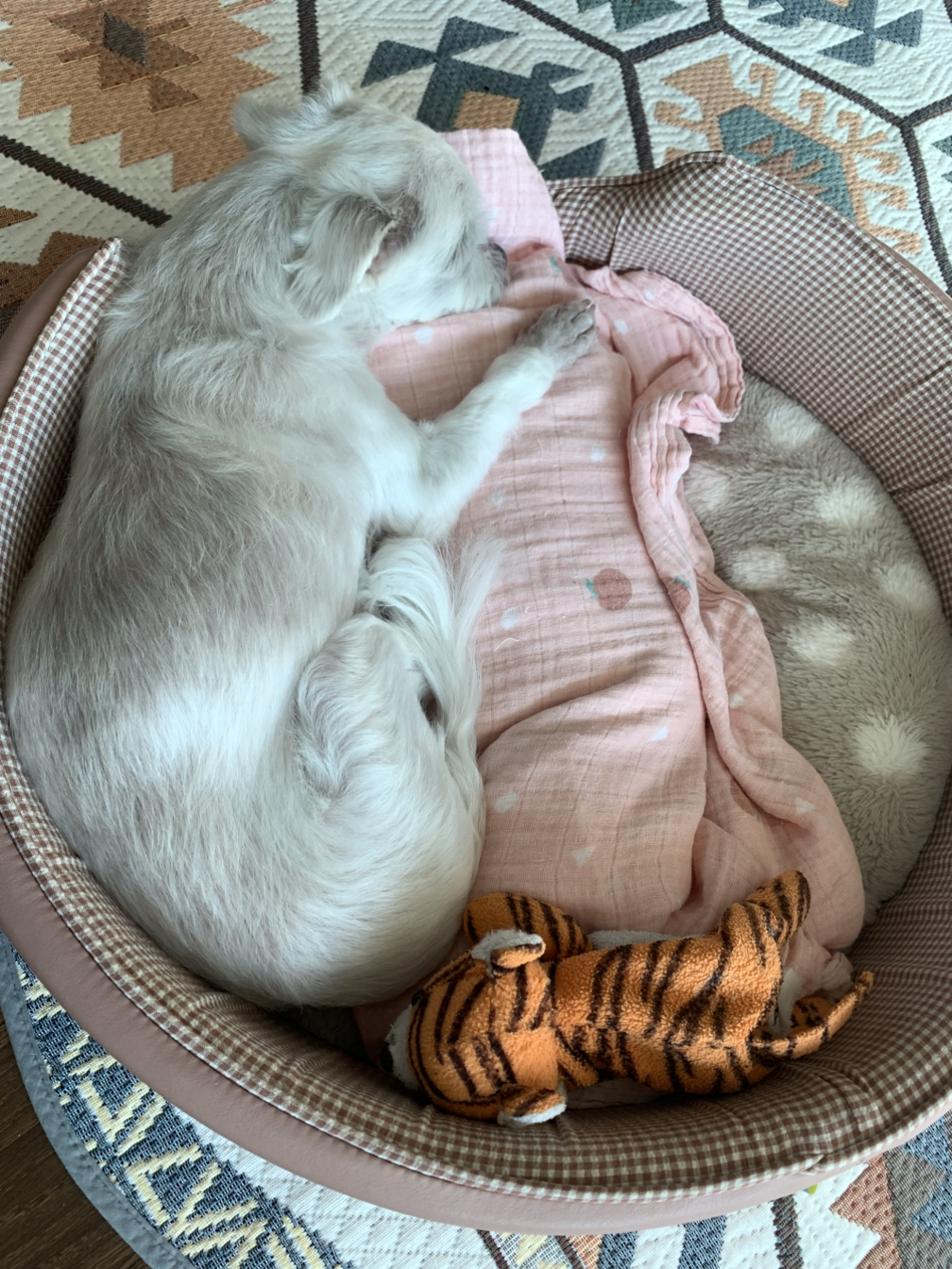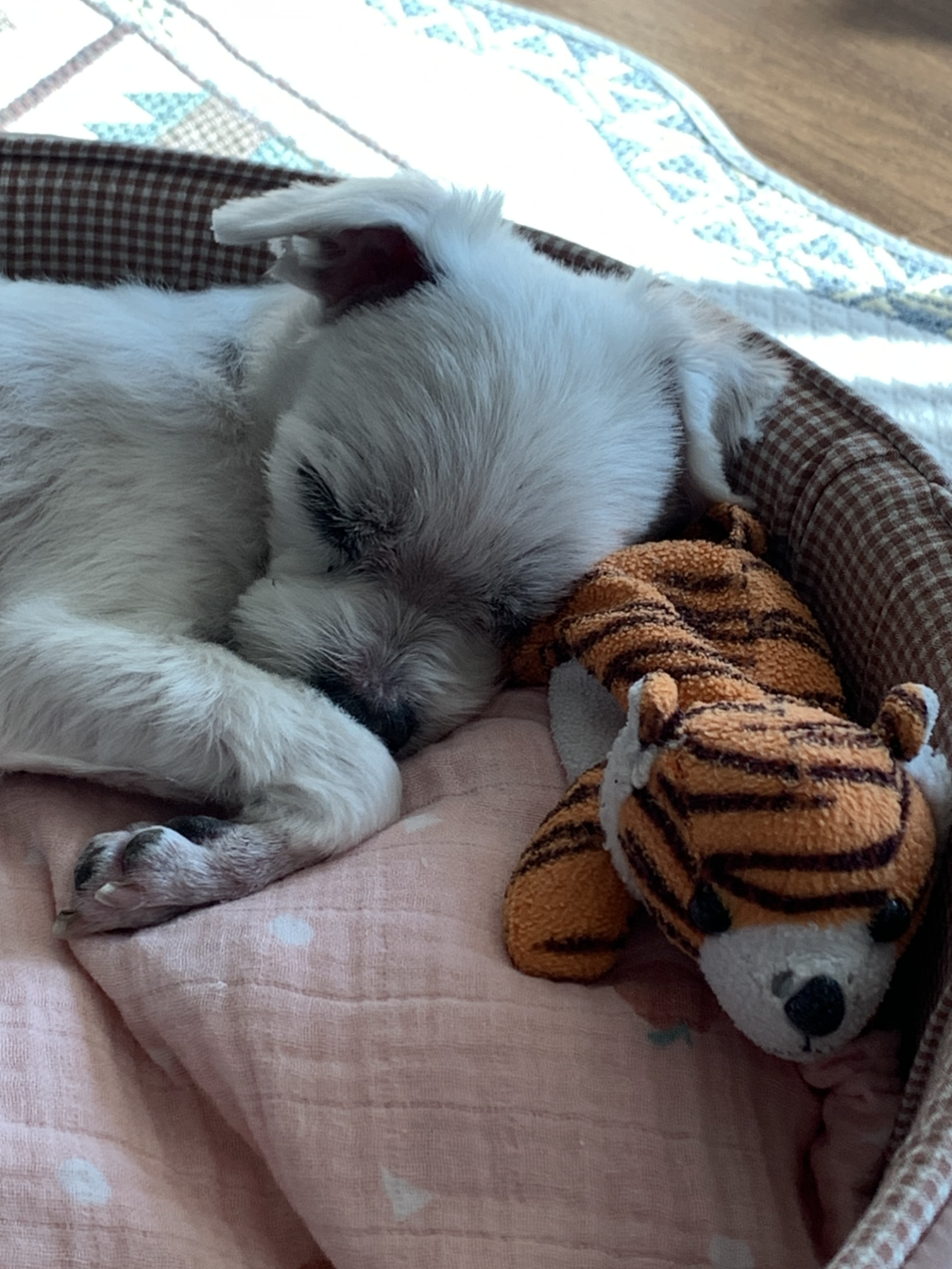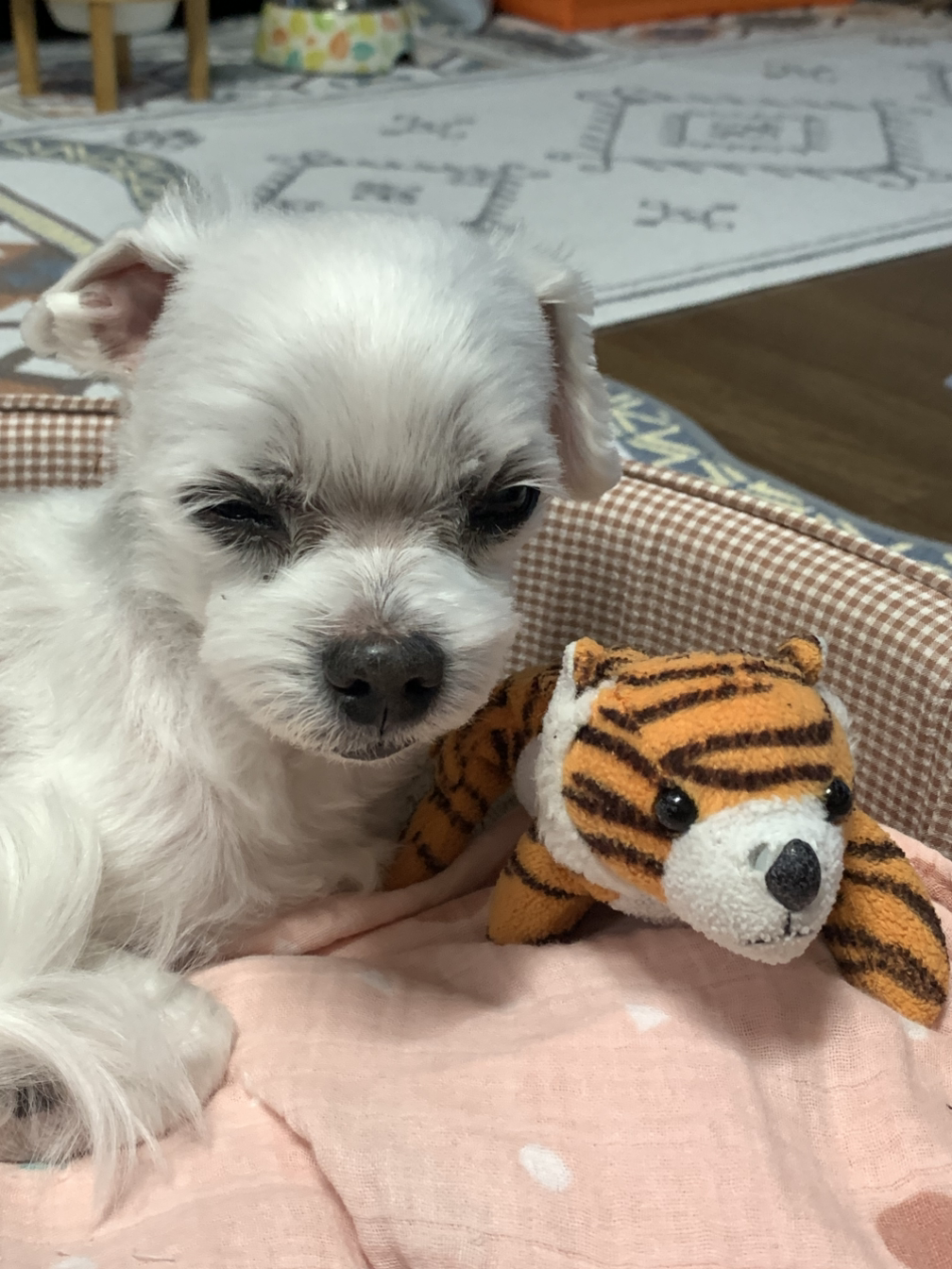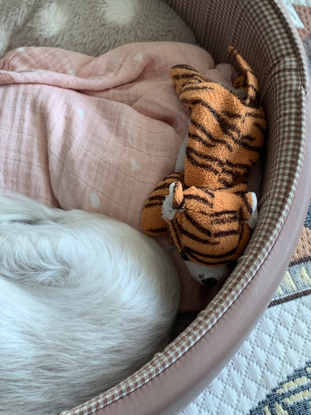 애착 호랭이랑 자요. 비누가 이갈이를 할때 저 꼬리를 잘근잘근 씹었었다.