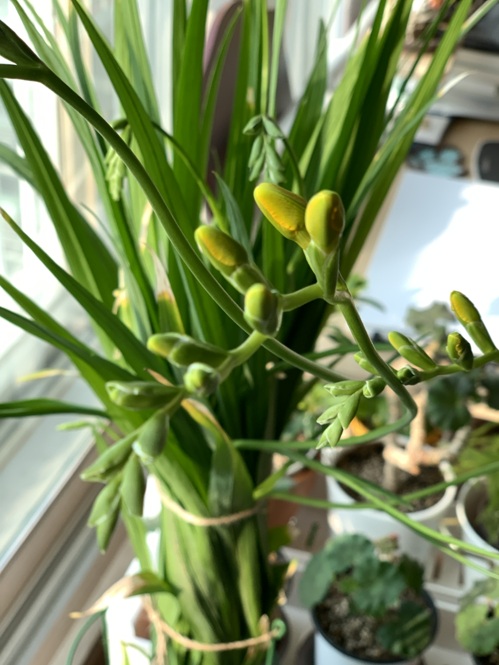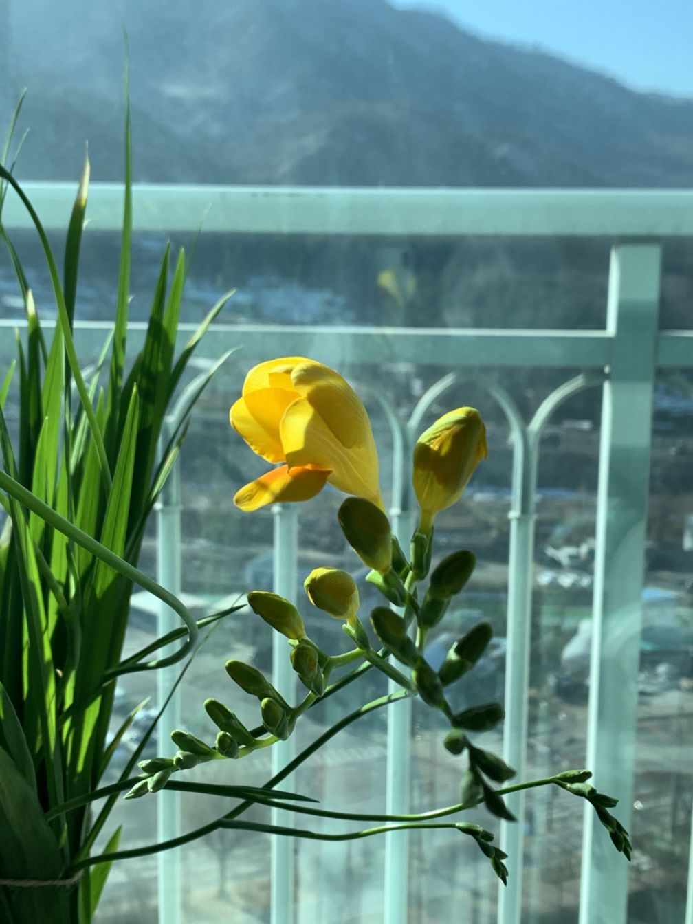 잠자던 프리지아가 싹을 틔우고, 길게 길게 난 인양 자랐다. 정신머리가 없어 꽃다발에서 나온 끈으로 묶어 단정히 해주니 한결 낫다. 3단으로 끈이 묶이면 드디어 꽃망울이 나오기 시작한다.