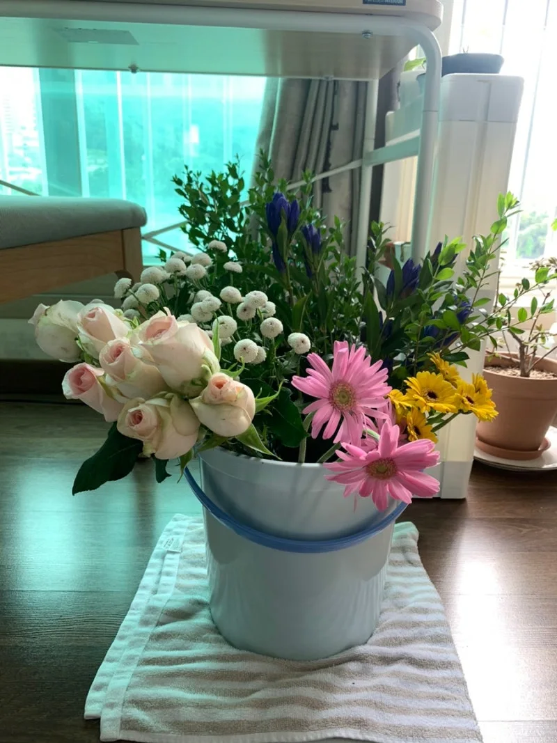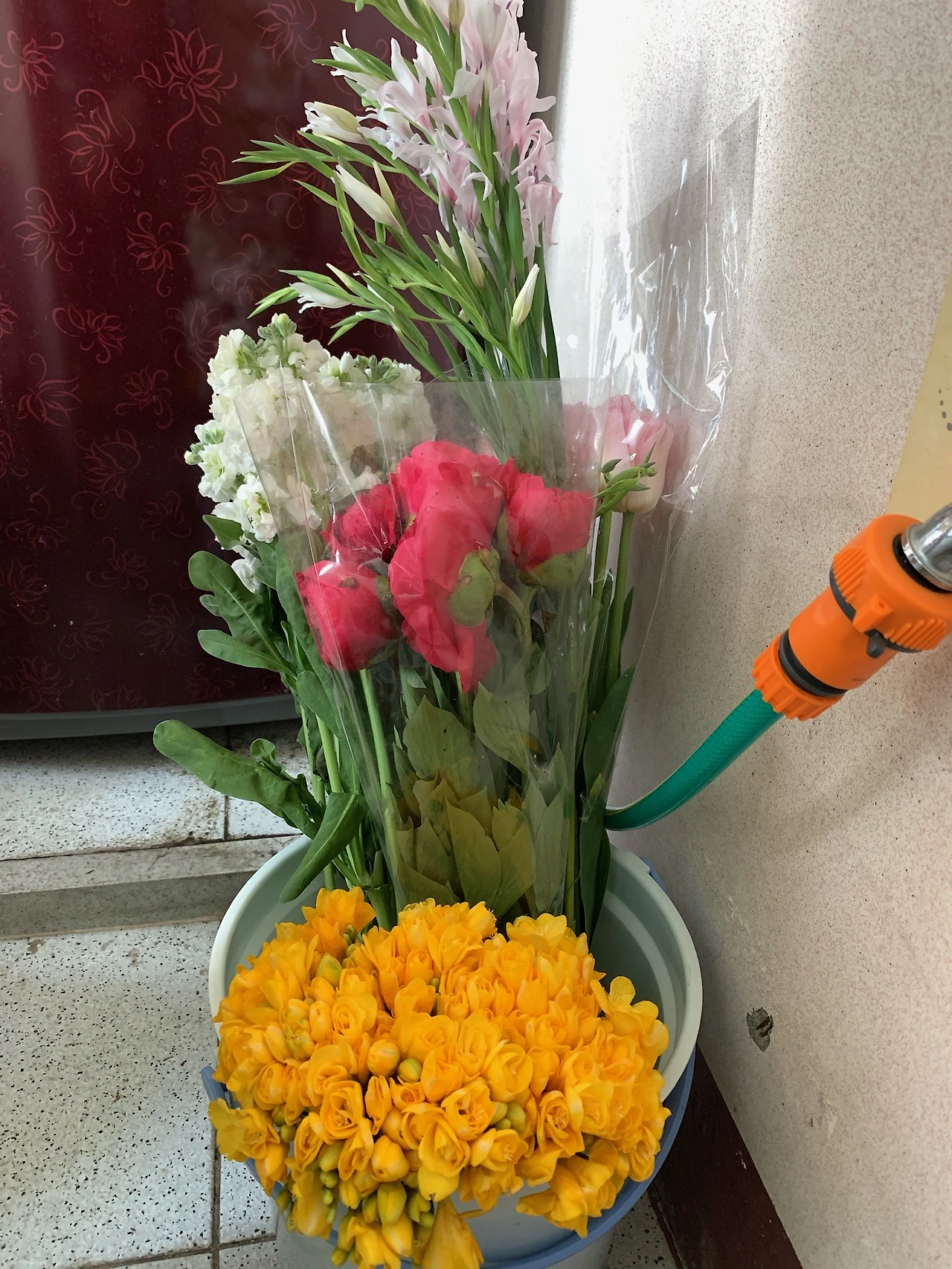 버킷을 채운 꽃의 양이 좀 아쉬워 보이지만 아침이 되면 밤새 물이 올라 꽃의 부피가 많이 늘어나며 행복의 지수가 올라간다.