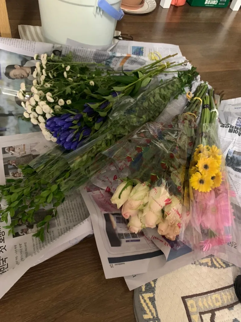 꽃다발이 마음에 안들지만 꽃은 한결같이 향기롭고 예쁘다.