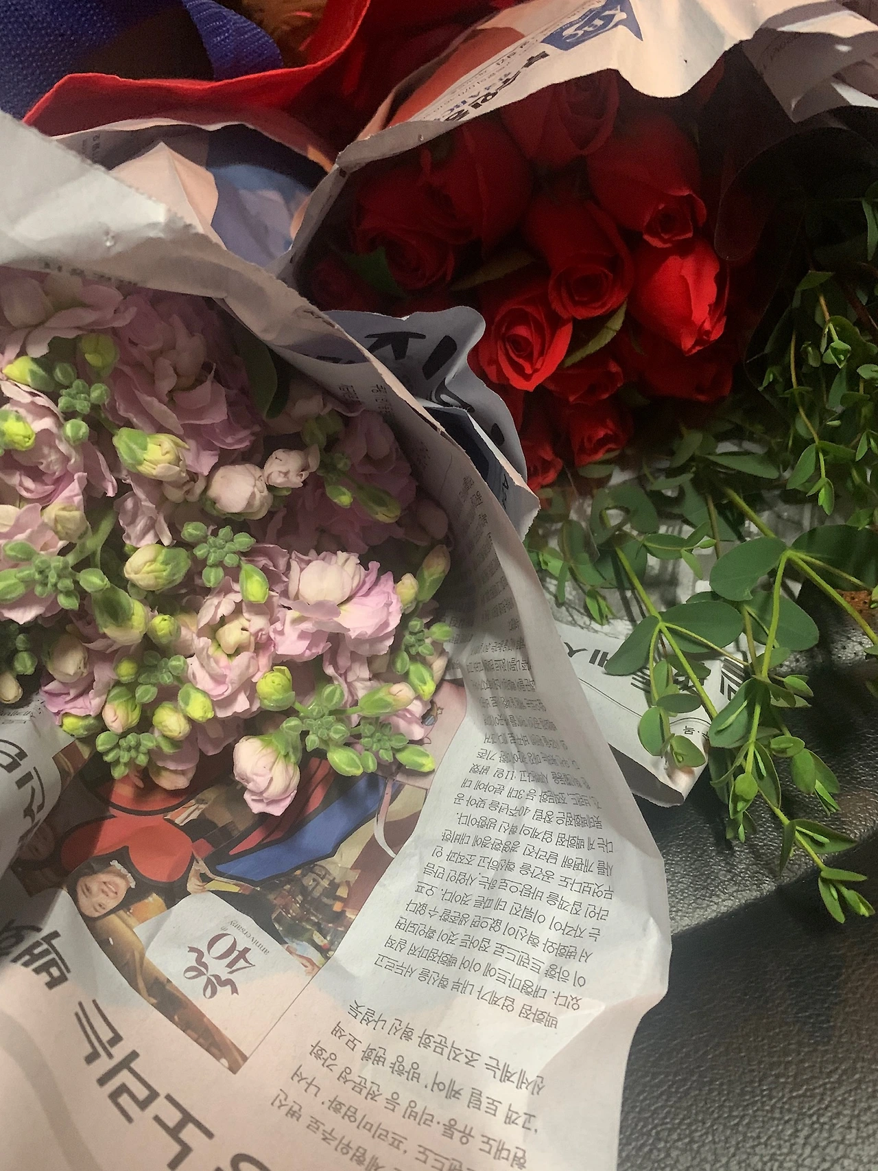아주머니의 노고가 들어간 장미 한 송이를 건네니 바스락바스락 건조한 남편이 깜짝 놀라며 스쳐 지나가듯 찰나의 미소를 지었다.