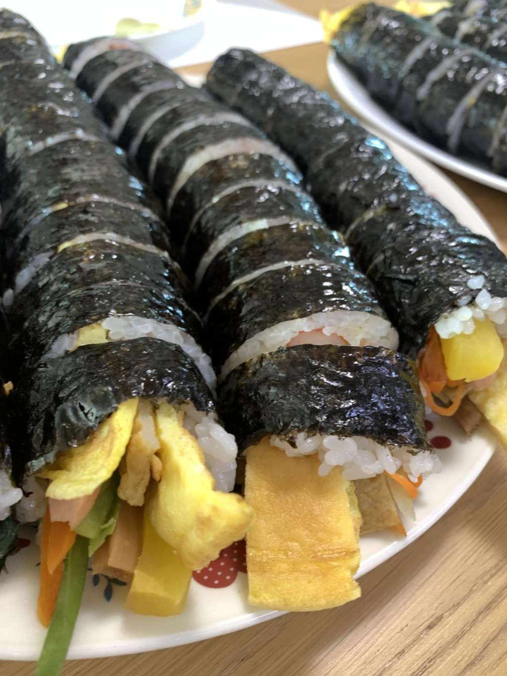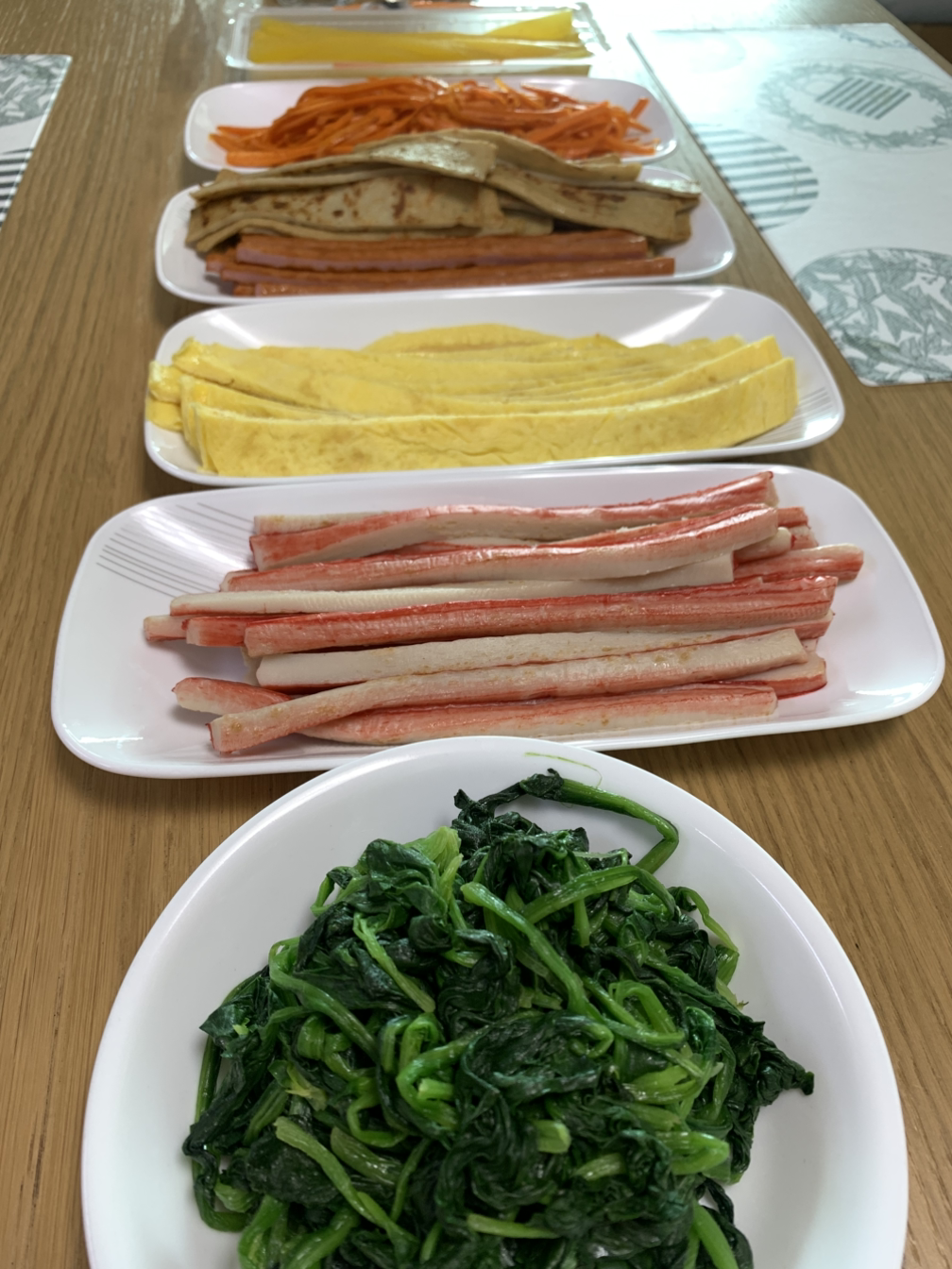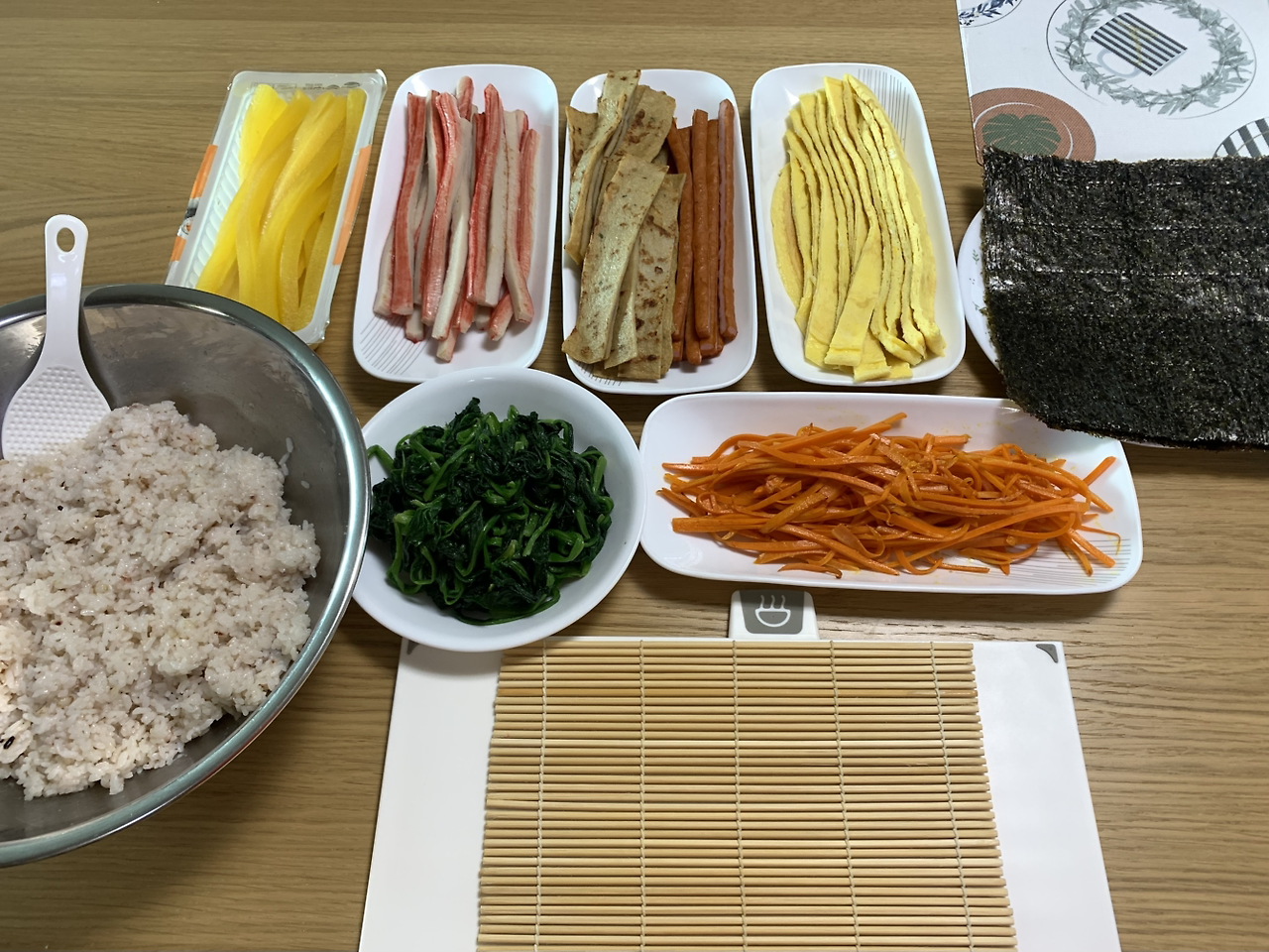 흰 밥이 고슬고슬하게 지어지는 동안 시금치를 데치고, 분홍 소시지와 몽둥이 같은 노란 통단무지를 길쭉하게 썰었다. 우엉조림은 전날 해두었고, 계란으로 동그란 지단을 많이 만들었다. 커다란 쟁반에 준비된 재료를 나란히 담은 뒤 살짝 구워 비릿함을 날린 김까지 준비되면 드디어 김밥을 말기 시작한다.