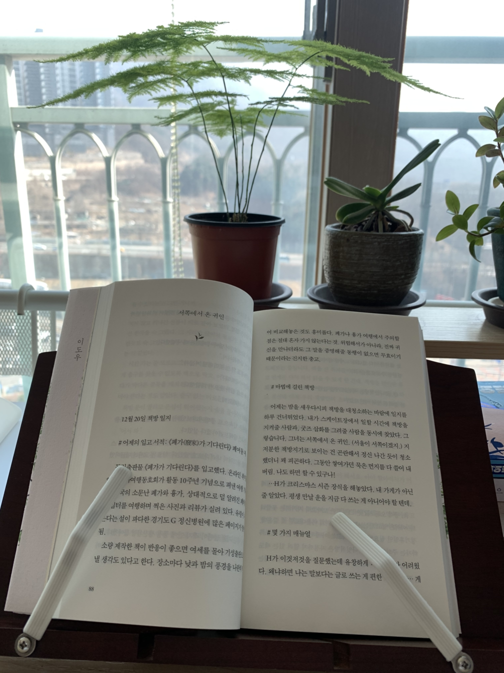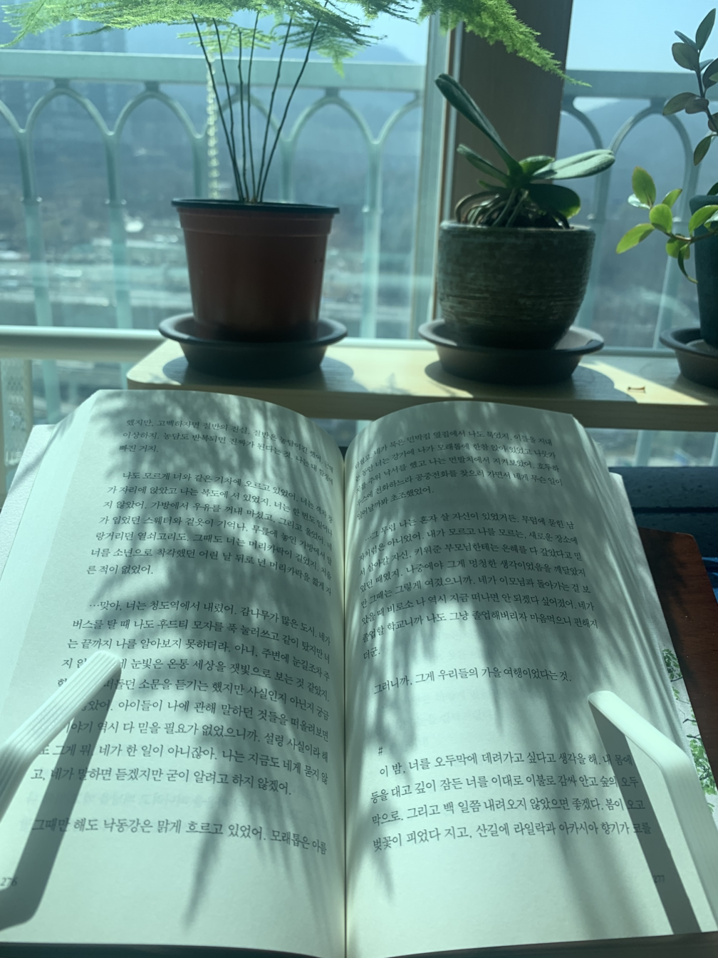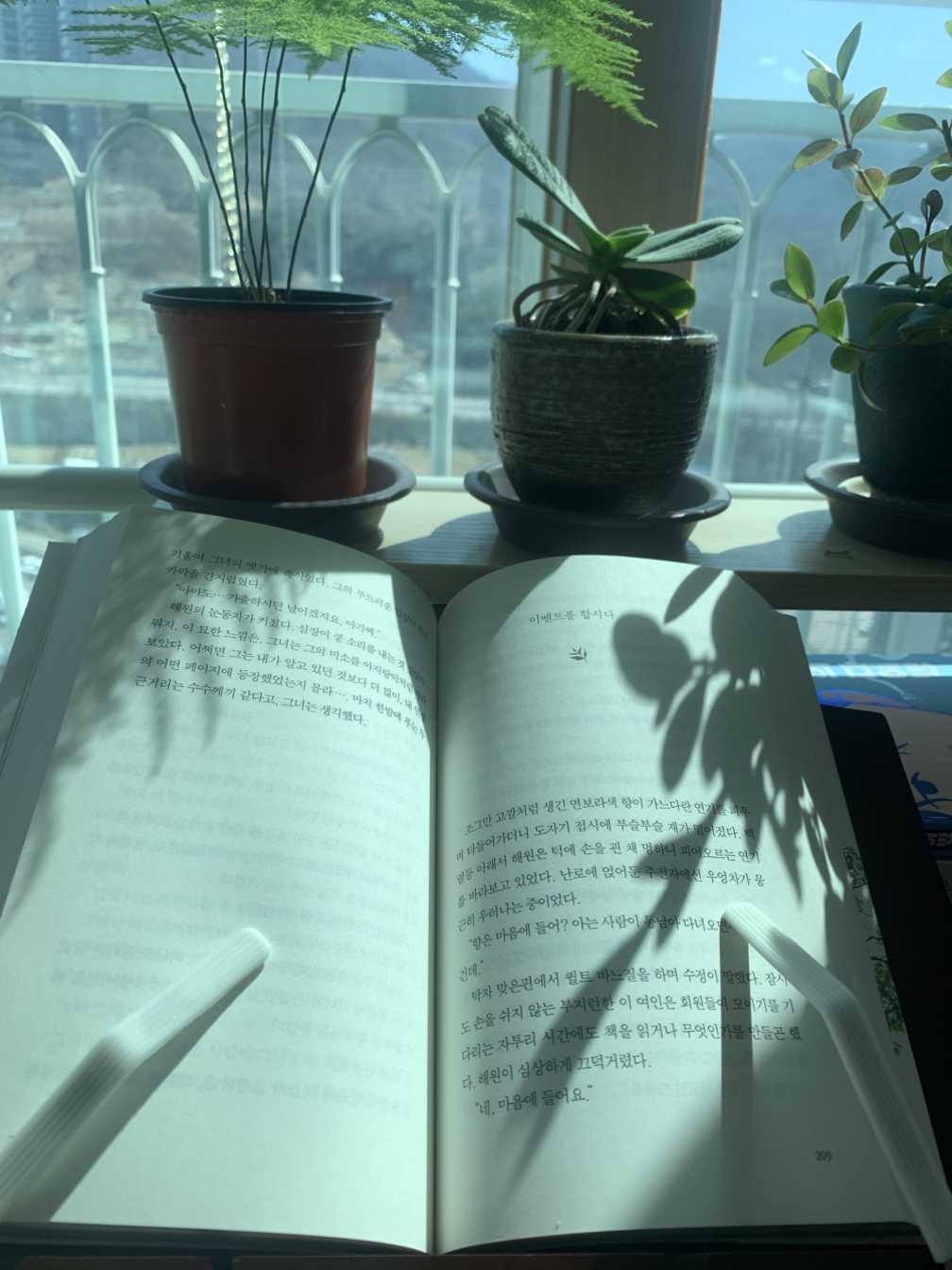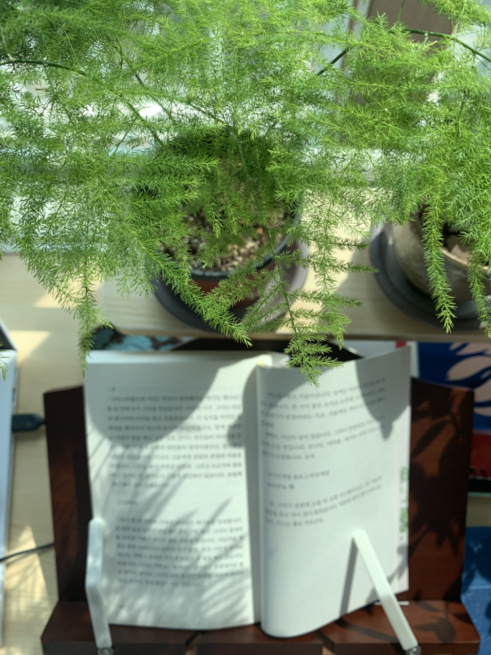 왠지 아스파라거스 나누스의 그림자 아래서 읽고 싶었다. 아스파라거스 나누스가 네 개의 잎을 새로 펼쳤는데 그 빛이 아주 청명하고 예쁜 연둣빛인 것이 마음에 든다.