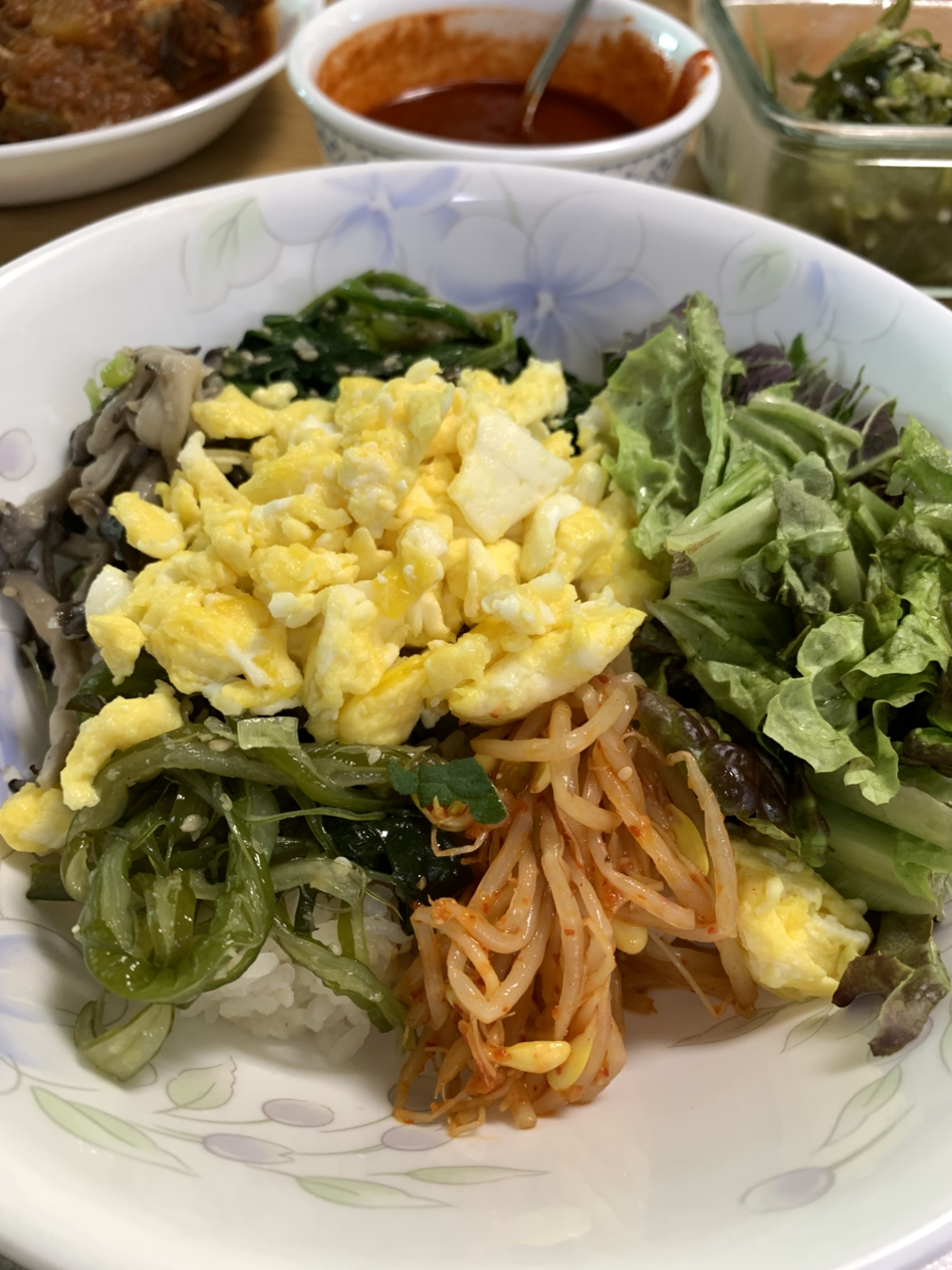 나물 반찬이 조금씩 남았을 때 양푼에 모두 다 넣고 상추도 손으로 북북 뜯어넣어 비벼서 나누고, 계란은 취향대로 반숙 또는 완숙으로 굽는 정성스러운 서비스 정도를 해서 올려준다. 열무김치가 있으면 아주 금상첨화다. 참 이상한 것은 각자 비벼먹으면 더 맛있을 것 같은데 꼭 내가 비빈 것이 맛있다고 한다.