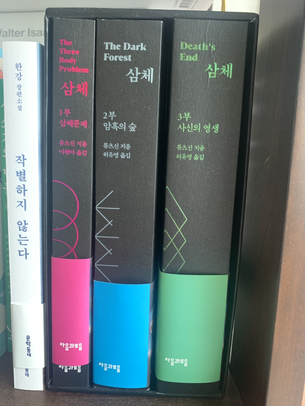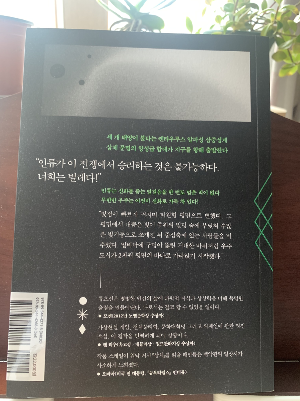 예상컨대 모든 것이 낯선 이 번역본 책은 100 퍼센트 감명받기 실패가 예상된다. 공상과학이라는 낯선 장르와 공감되는 정서를 갖지 못한 체제의 나라가 배경이 되고, 일자무식인 중국어가 원작인 번역본 책이 세권이나 된다. 책을 전날 밤 서점 바구니에 넣고 눈 뜨자마자 고민을 한다.