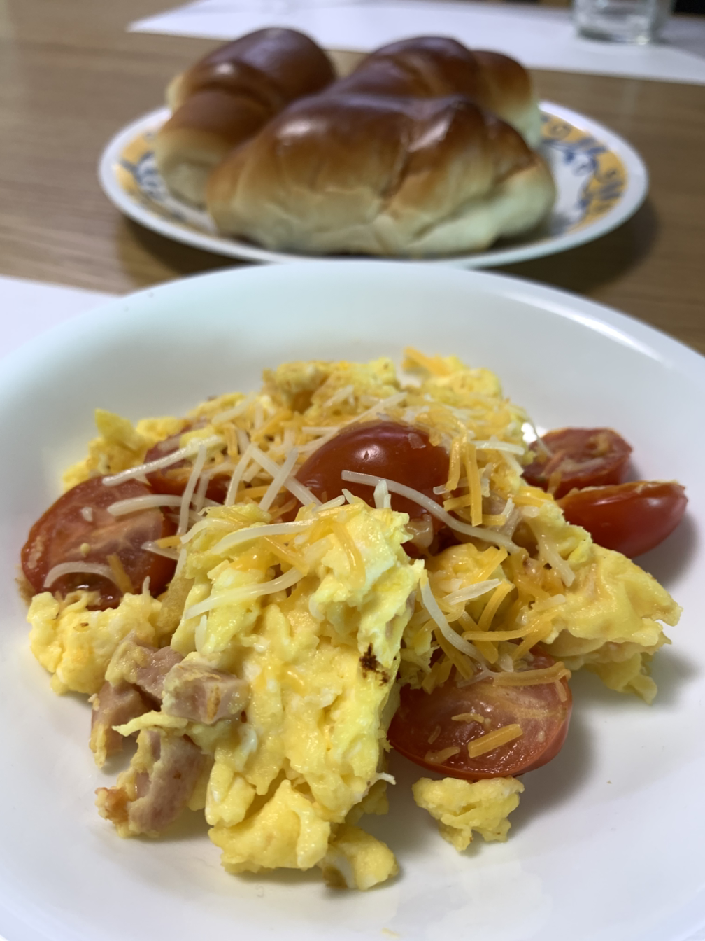 계란에 소금을 조금 넣고 푼다. 중약불로 스크램블을 하다가 반쯤 익으면 소시지를 넣고 섞으며 볶는다. 거의 다 익을 무렵 한쪽으로 밀어 두고 토마토를 볶다가 불을 끄고 합체하여 마무리.. 걸린 시간은 3분 이내.