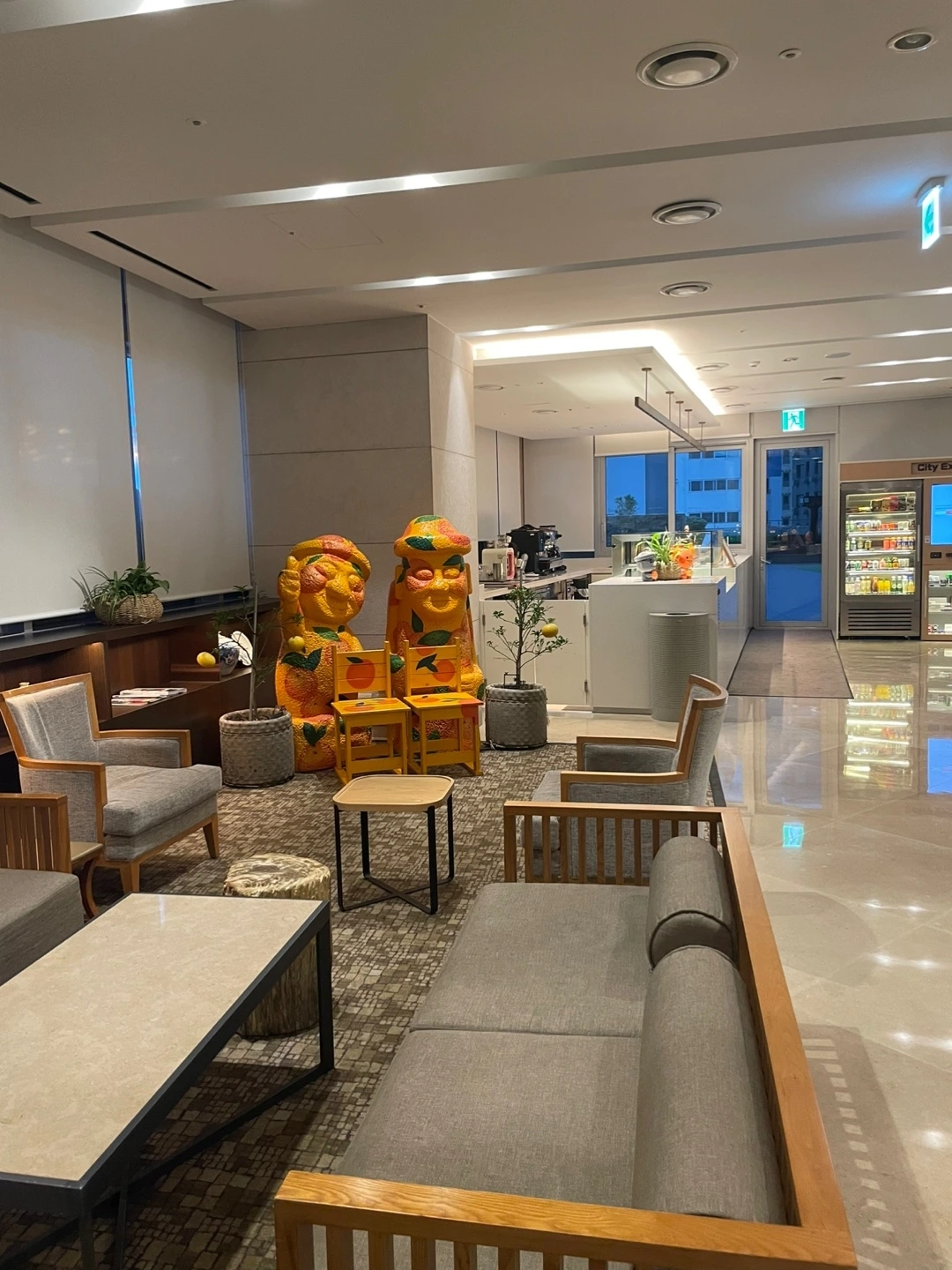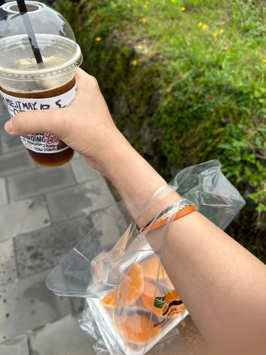 커피와 함께 손에 든 한라봉 떡 사진..