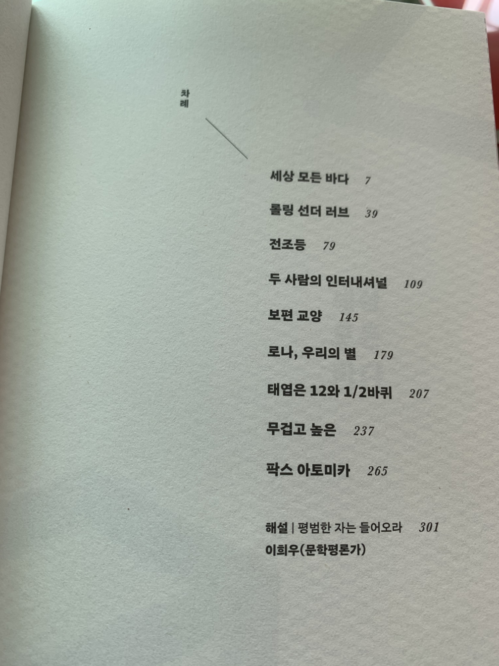 보통 단편 소설 모음집은 모두가 흥미롭기는 어렵다. 길어진 글 임에도 이 책 속 아홉 개의 소설은 각각의 독서 후기로 적고 싶을 만큼 아쉽다. 담지 못한 글과 여운을 책을 읽는 이의 특권으로 남겨두기로 한다.