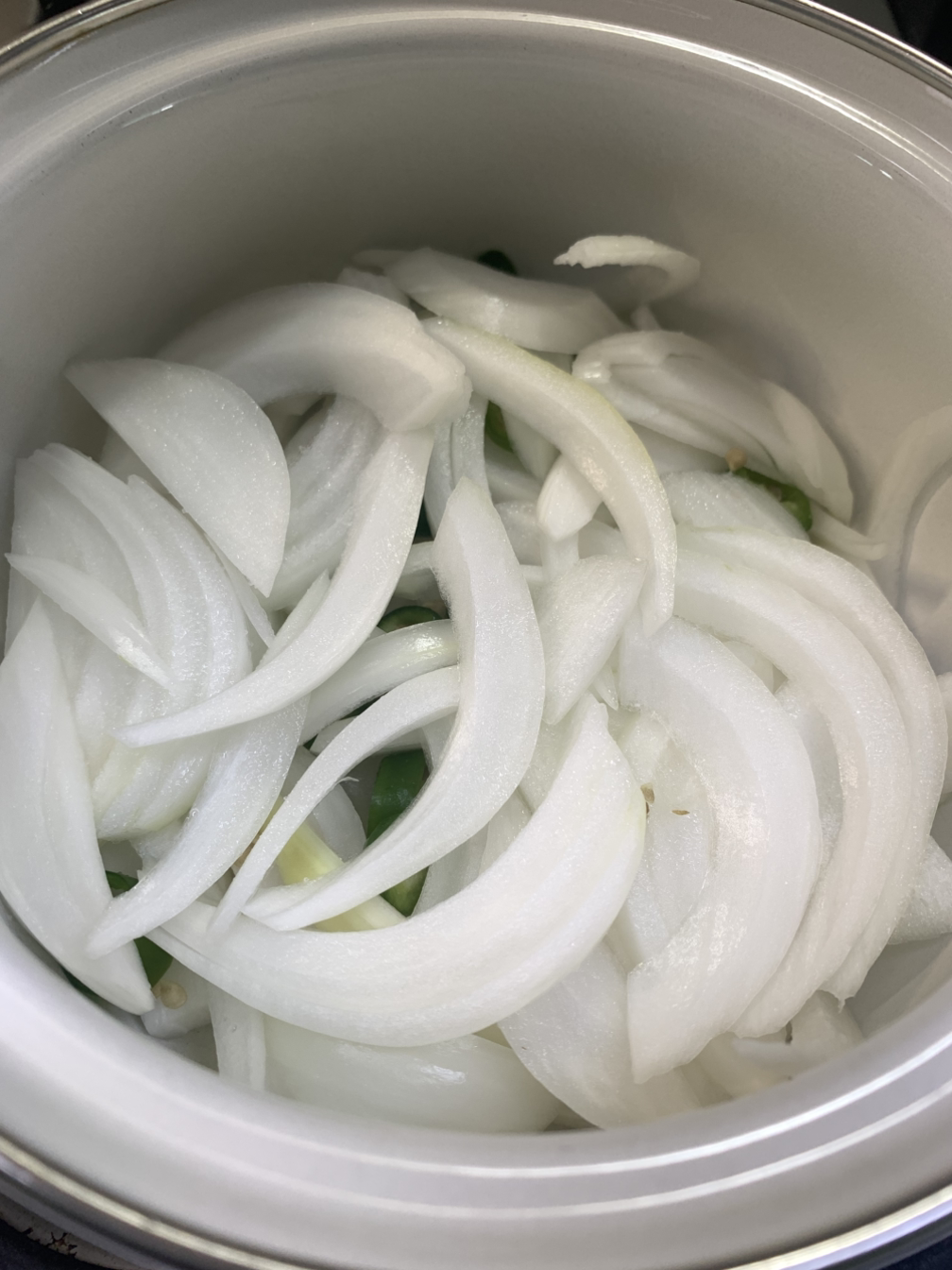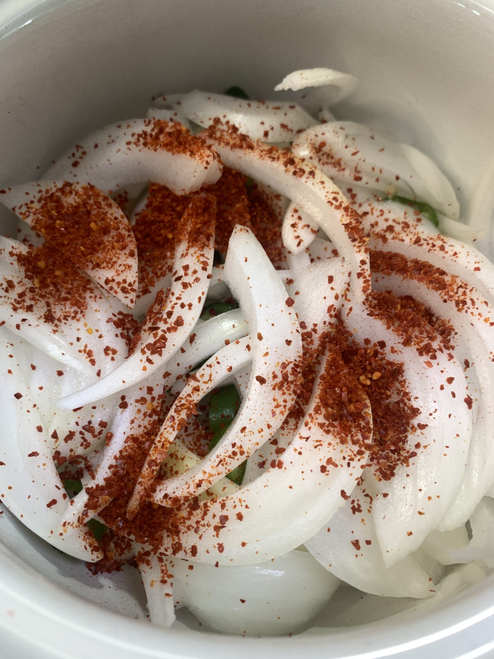 1. 양파를 반쯤 냄비 바닥에 깐다. 청양고추 반도 술술 뿌려준다. 그 위에 다시 양파 이불을 덮고 소금 조금과 고춧가루를 솔솔 뿌려준다.