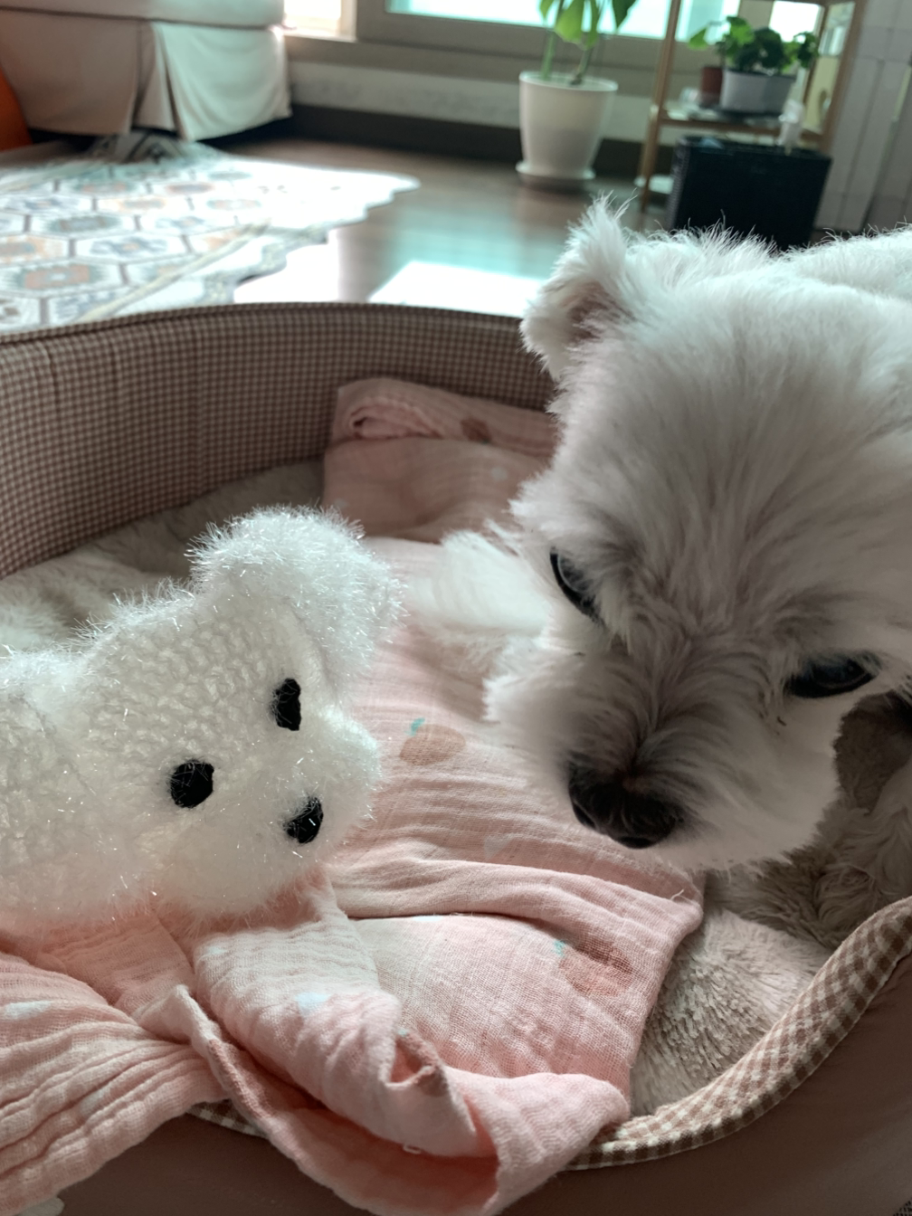 비누의 털이 참 귀엽게 자랐다 싶으면 그것은 미용 가는 날이 도래했다는 뜻이다. 간밤에 비누 모양 수세미를 떴는데 영 비누 같지 않다. 오히려 짱구네 흰둥이 같다. 다시 여기저기 비누와 비슷한 강아지 모양의 도안을 찾아 돌아다니다가 찾는 것을 그만두기로 했다.