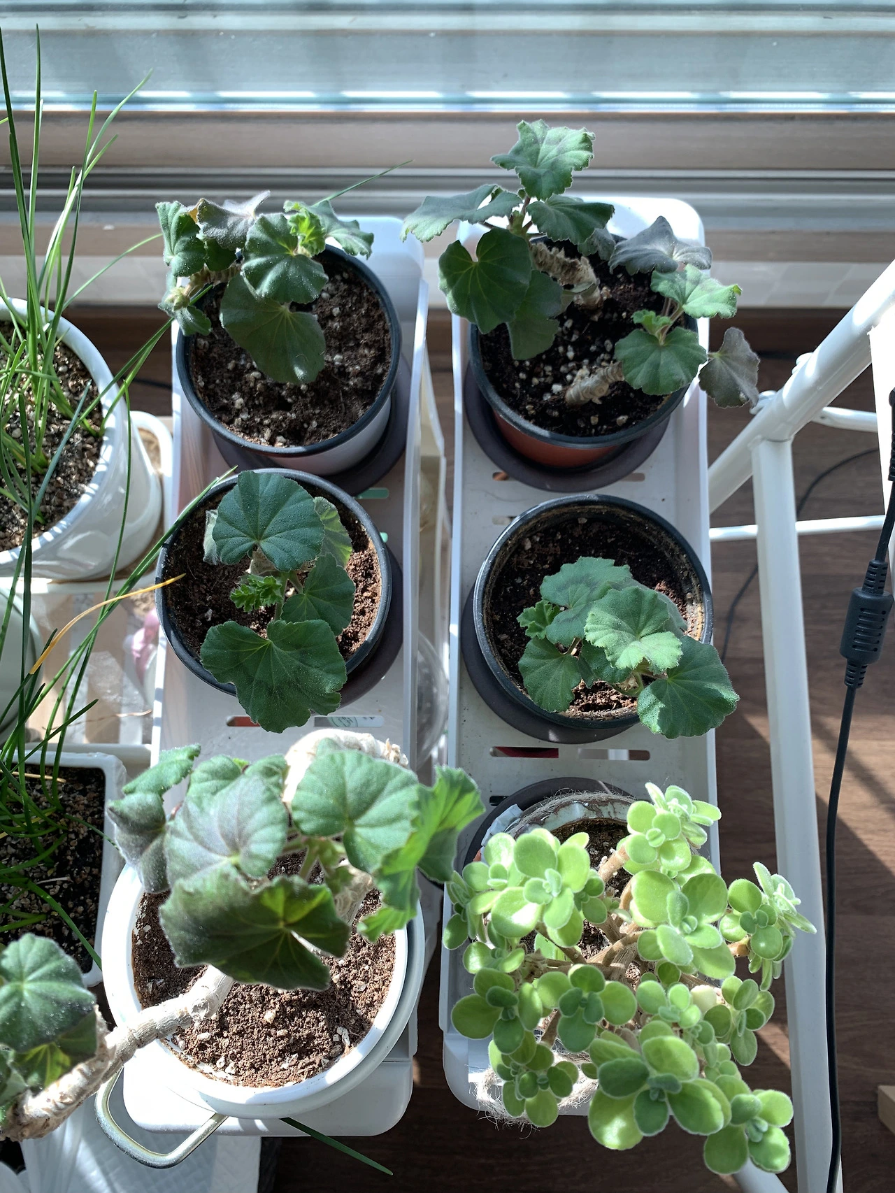 제라늄이 작년에 만들어두어 검은색이라 생각될 만큼 짙어진 초록잎 사이에서 새로 내민 보드랍고 촉촉한 연둣빛 잎들이 섞여 생기가 돈다.