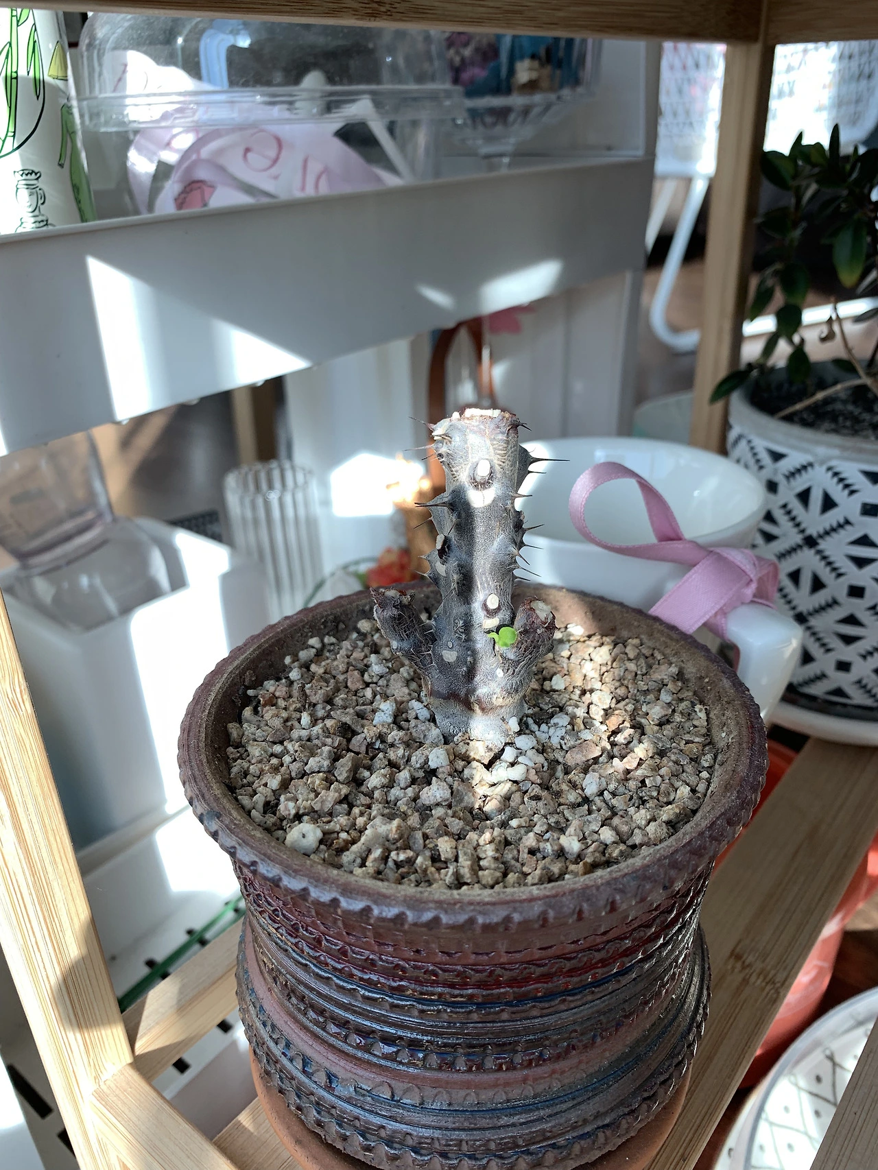 그리고 지난번에 고민 끝에 죽느냐 사느냐는 오로지 운명에 맡기고 흰꽃기린을 썽둥 잘랐다. 보고 있으면 자꾸 마음이 쓰이니 한쪽 구석에 처박아두었다. 마치 죽은 나무토막 같았다. 그런데 웬일인가!
