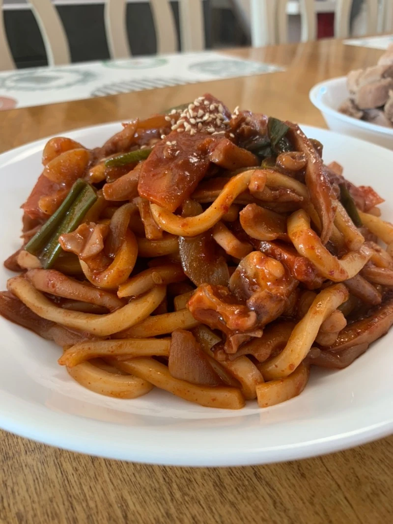 딱 1인분이 남았을 때 우동사리를 살짝 삶고 청양고추도 송송 썰어 넣고, 남은 오징어볶음과 함께 달달 볶아주면 내가 좋아하는 매콤 우동볶음이 된다.