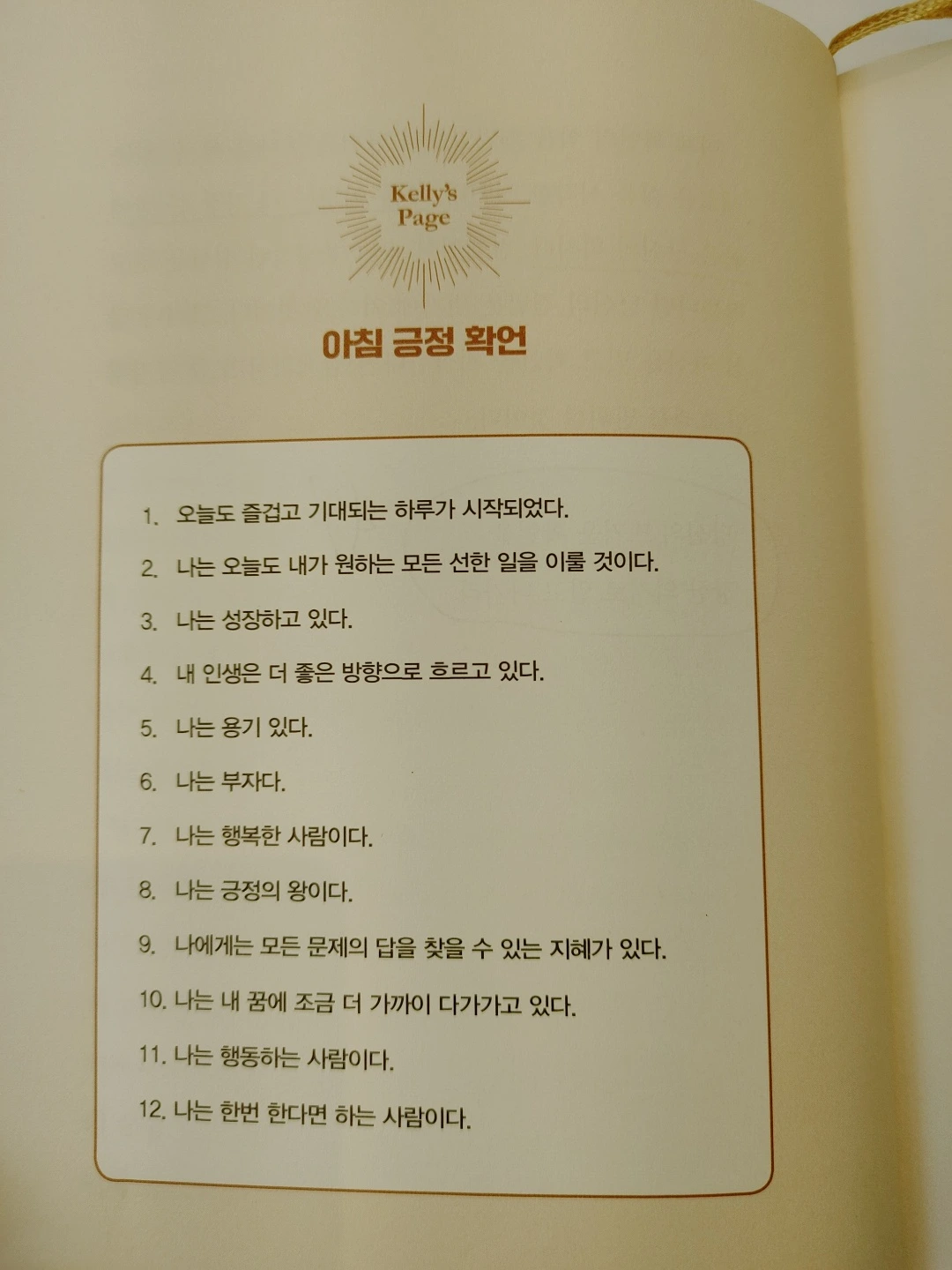 부를 위한 생각의 초석은 선언하고, 확신하고, 확언하는 것이다. 아무리 확고한 결단도 머릿속에만 있다면 없는 것이나 다름없다. 선언하라. 자기 삶을 진취적으로 이끄는 사람은 선언할 수 있어야 한다. 결단을 내린 후 실패하지 않기 위해서는 필수적으로 선언을 해야 한다. 난데없는 큰 난관이 드리워지면 답이 없다고 느끼는 것이 아니라 아직 답을 찾지 못한 것이라고 생각한다. 켈리 최는 결단과 선언을 즐긴다고 한다.