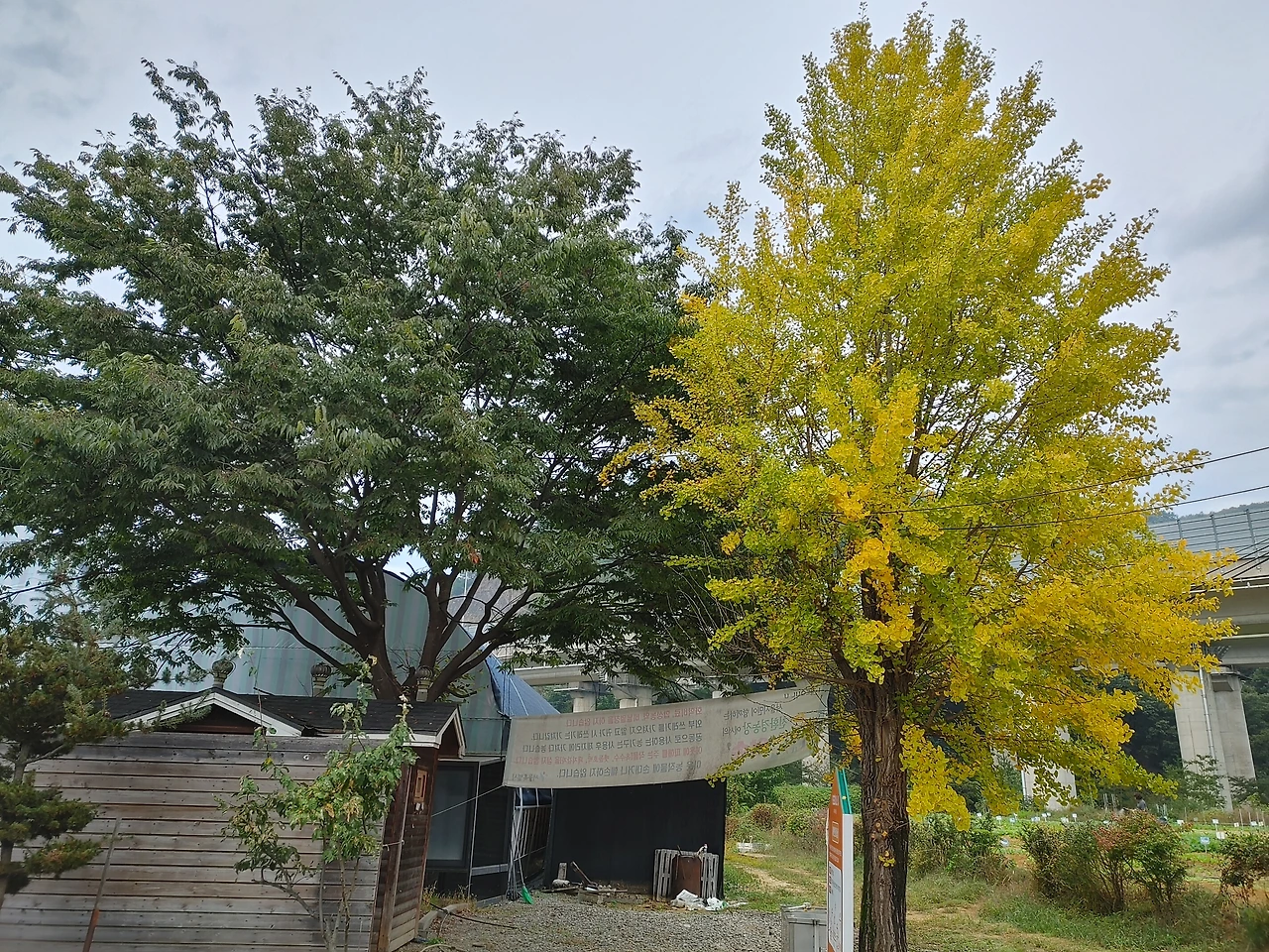도시 농부의 걱정과 다르게 은행잎은 점점 물들어가고 있다.