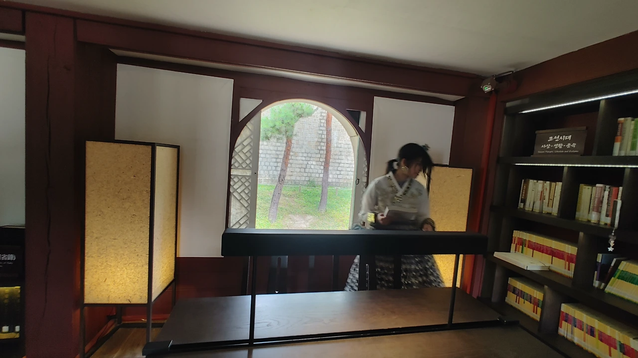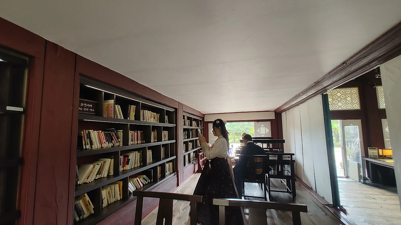 사람들이 많아서 발 디딜 틈이 없지만 책을 보겠다고 하면 책꽂이에서 한 권 꺼내서 쓰윽 읽어 볼 수 있습니다. 책은 조선의 역사와 조선 실록에 관련된 도서가 주로 있습니다. 책은 많지는 않으나 책을 읽는 사람이 많지 않기 때문에 책장에서 한 권을 꺼내 읽을 수 있습니다.