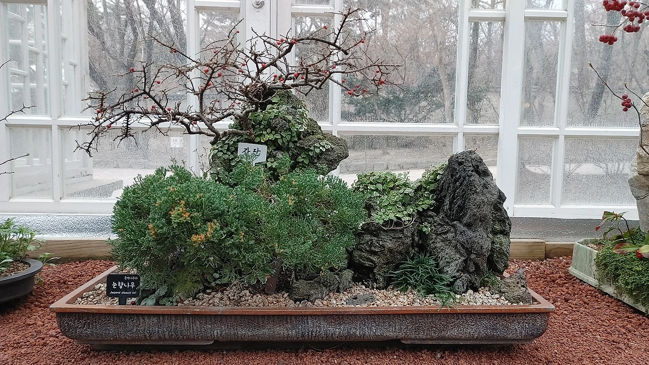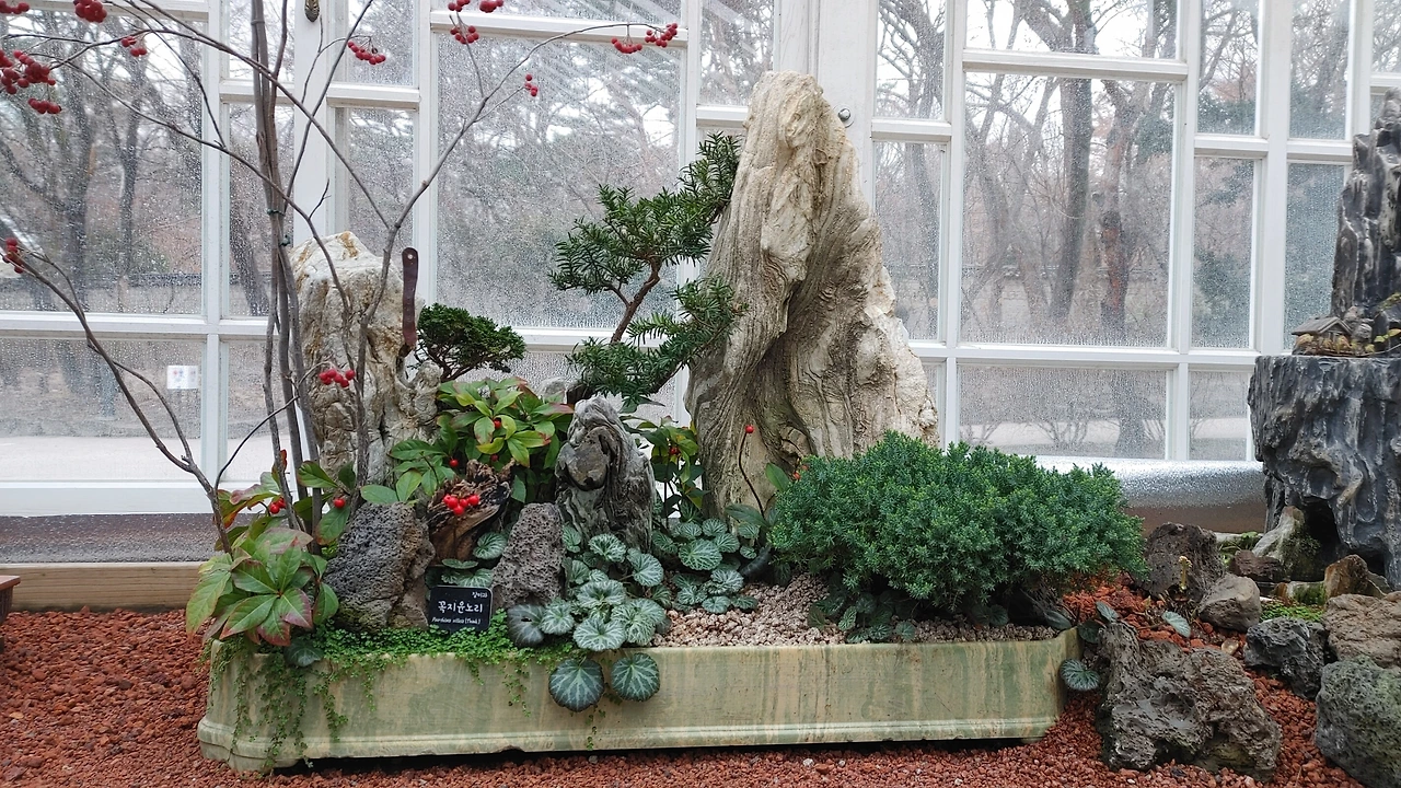 둥글게 원을 그리며 한 바퀴 돌면 어디에서도 볼 수 없는 분재를 만난다. 분재는 조선의 사군자 그림 앞에 서 있는 듯한 착각에 빠지게 한다. 자연석과 어울림이 한 폭의 산수화를 보는 듯하다. 분재를 어쩜 이리도 작고 아담하고 우아하게 만들었는지 감탄이 절로 난다. 사람의 손길이 얼마나 많이 닿았는지 느낄 수 있다.