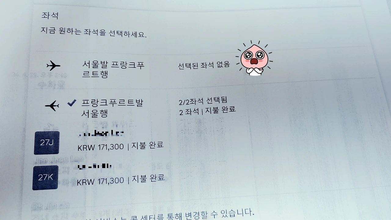서울발 프랑크푸르트행 출국 항공권에 '선택된 좌석 없음'으로 식겁했다.