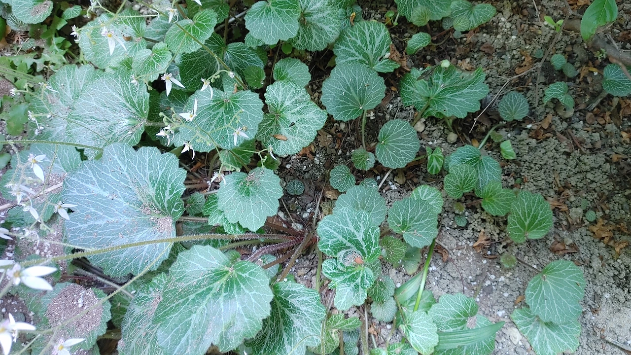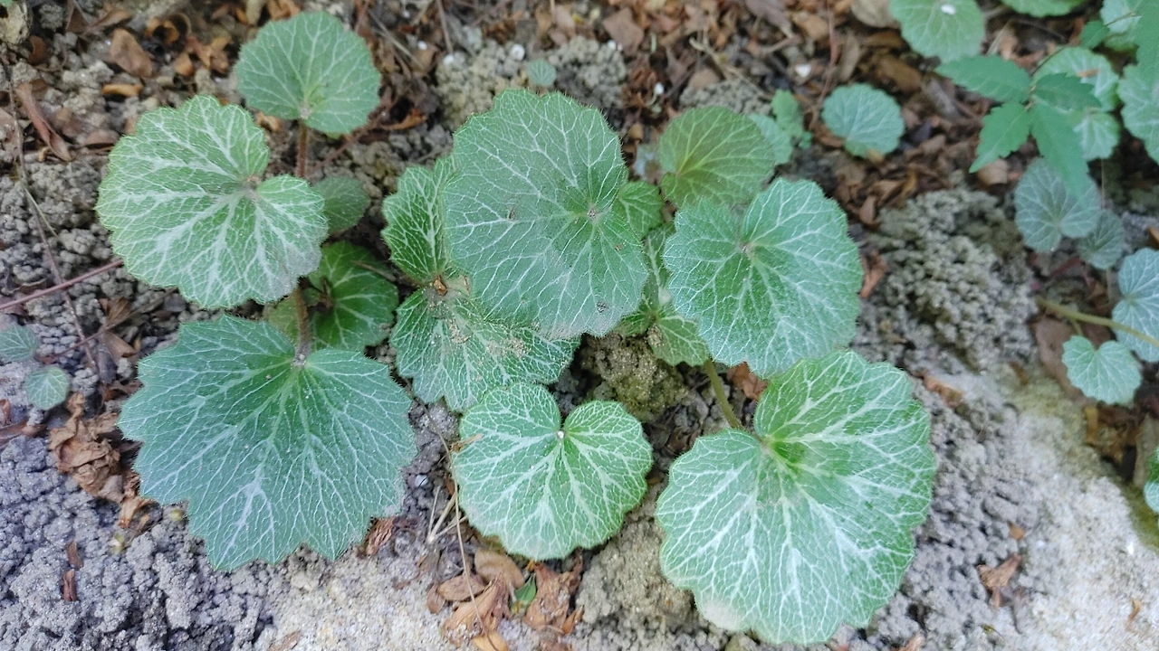 땅에 딱 붙어서 작은 부채모양 초록잎이 자라고 있다. 하얀 그물망이 있고 털이 있다. 까끌거릴 듯한 잎은 만져보면 부드럽다. 줄기와 잎은 땅에 한 곳에 모여 자라는데 그사이를 비집고 긴 줄기가 잎보다 배는 높이 자랐다.