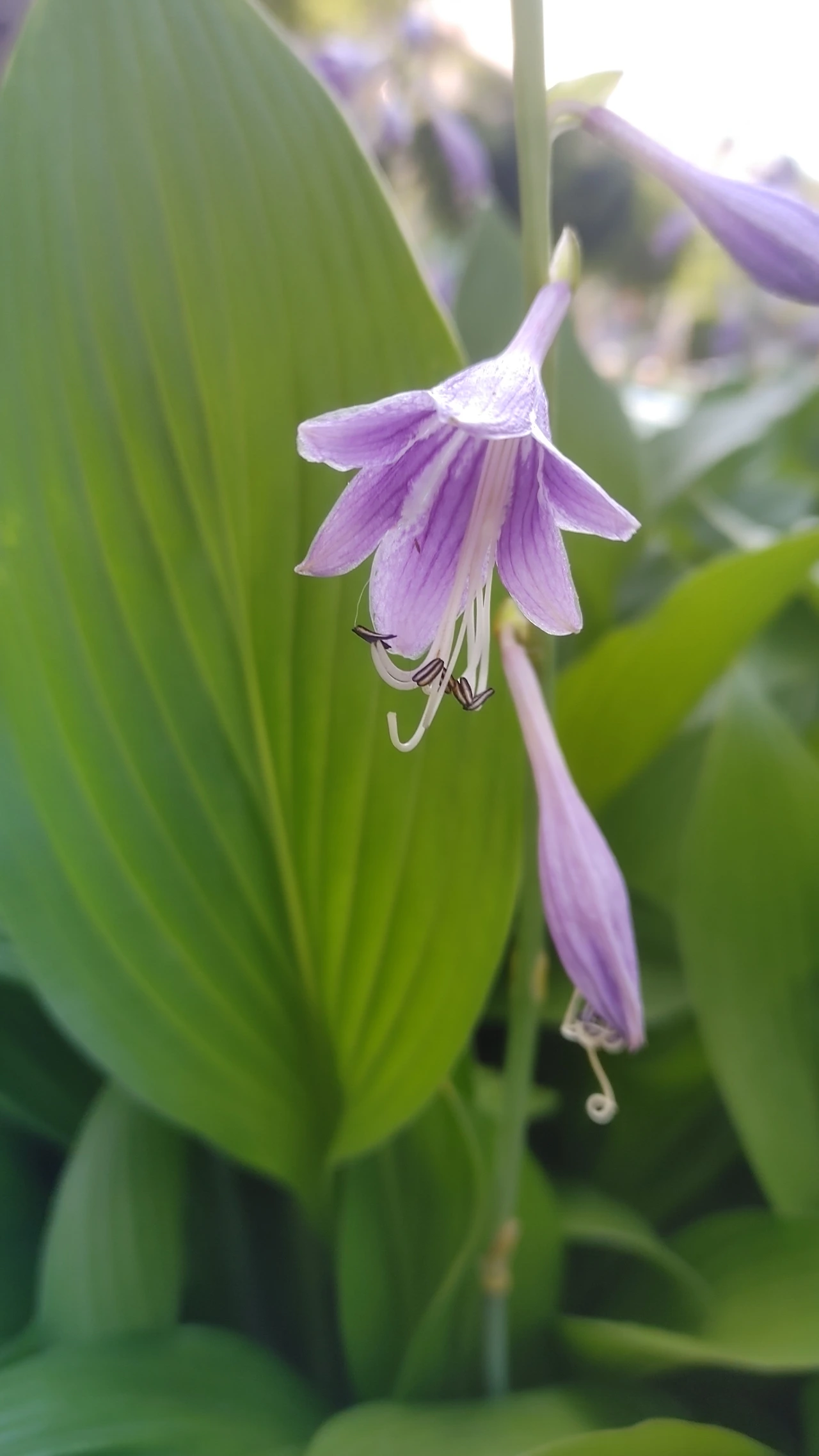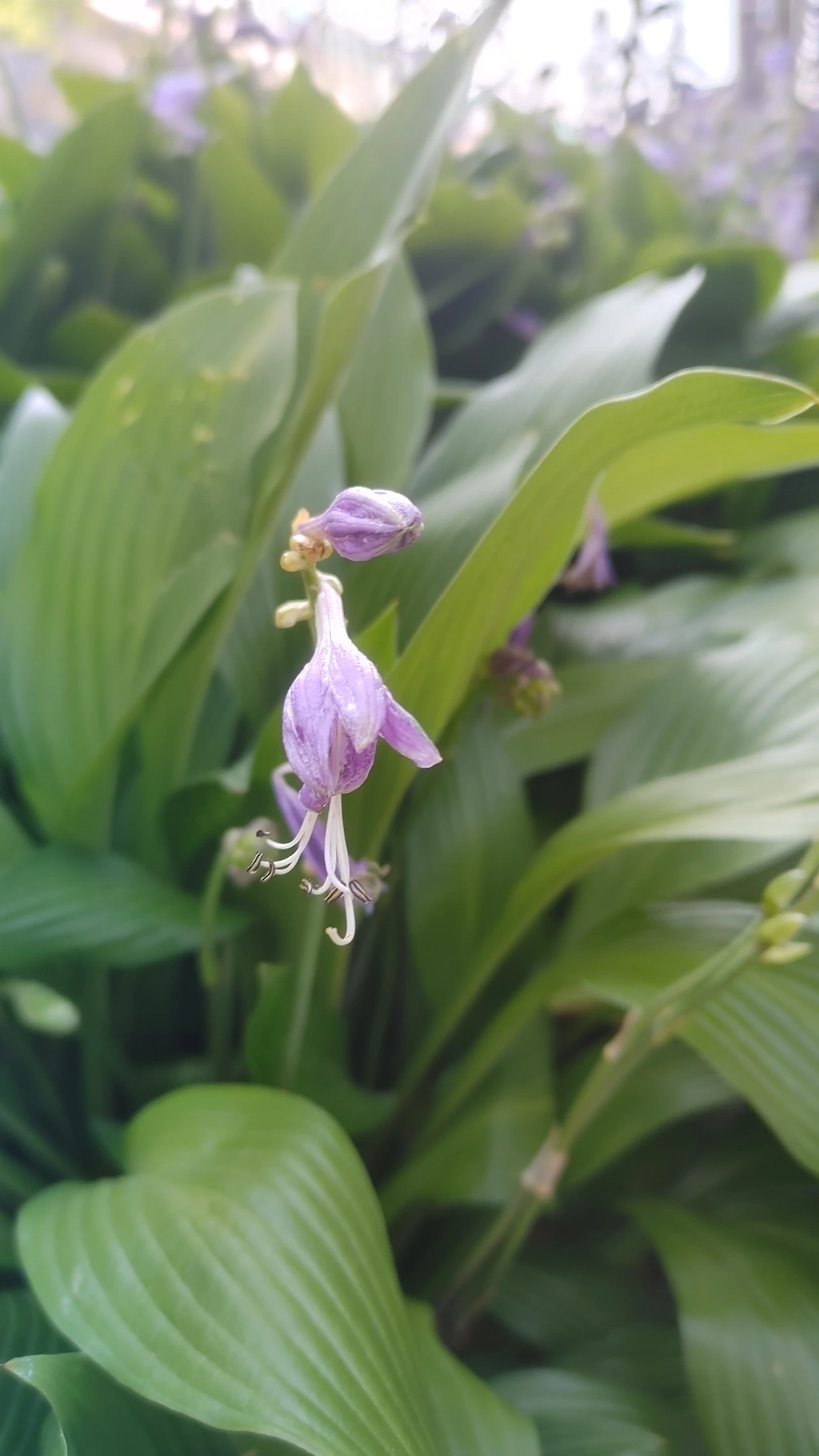 어느날 초록잎만 무성하던 식물에서 꽃대가 올라왔다. 꽃대 하나에 조롱조롱 꽃을 매달았다. 꽃은 아래를 보고 자라는 약간 긴 종모양의 하얀빛을 띤 보라색 꽃이다.