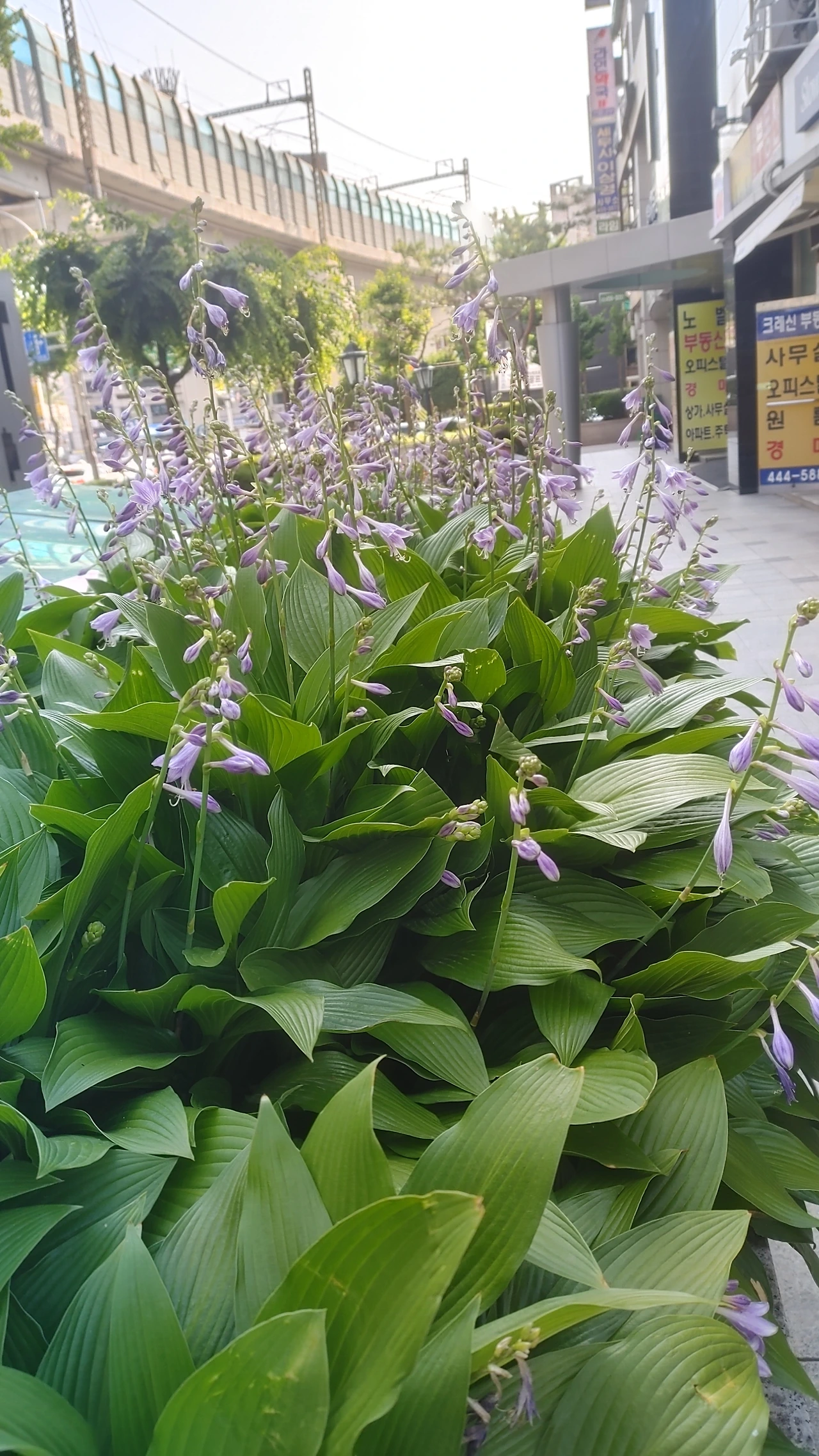 지하철에서 내려서 골목을 돌아서면 초록색 잎이 넓은 식물이 무성하게 자라는 화단이 있다. 잎은 뿌리를 중심으로 상추만 한 크기부터 손바닥보다 더 크게 자라기도 한다. 세로로 긴 잎맥이 십여 개 있다.