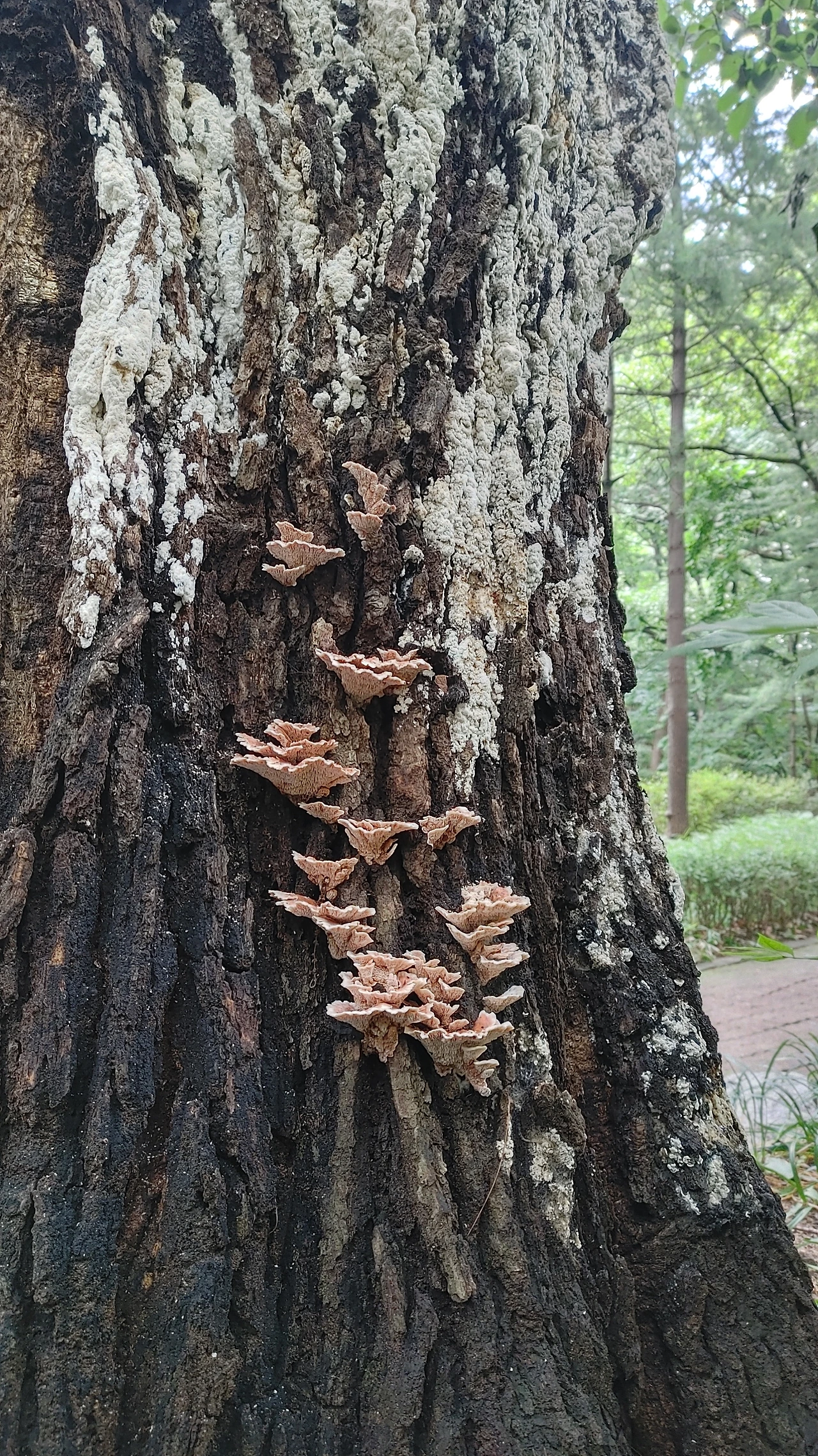 하얀 이끼가 피어오르고 연 노란 버섯이 층층이 자리를 차지했다.