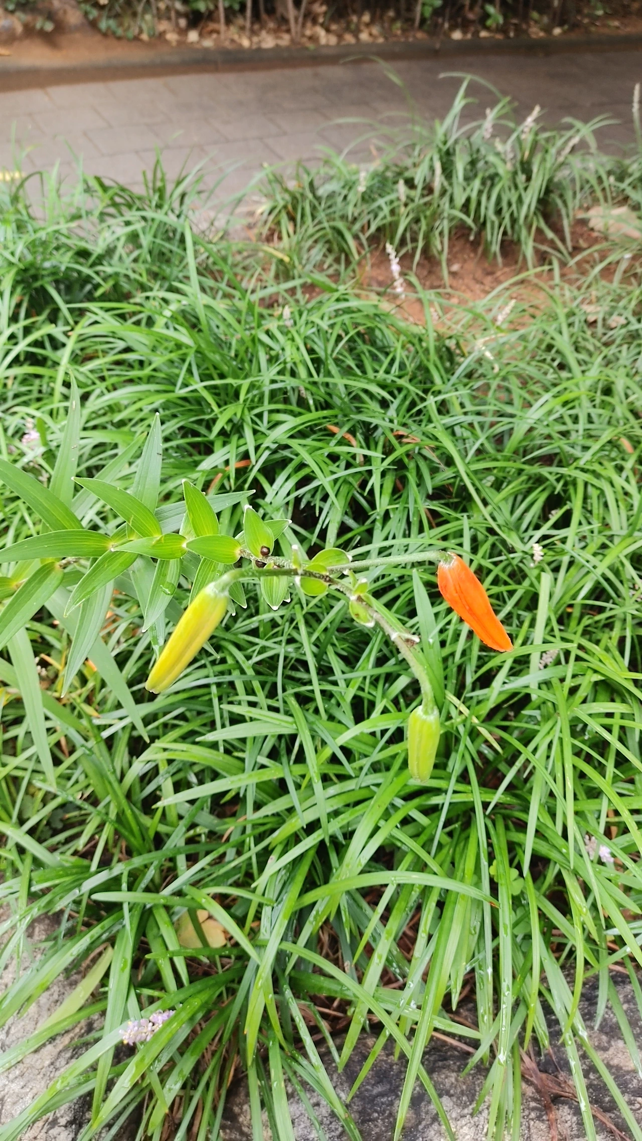 어디서 날아왔는지 나리꽃이 길게 자랐다가 제키를 못 이겨 쓰러졌는데 빼꼼히 빗방울을 머금은 모습이 시선을 끈다. 연둣빛 꽃이 진한 다홍색으로 활짝 열리면 나비처럼 활짝 날아오를 텐데 아직은 제모습을 감추고 있다.